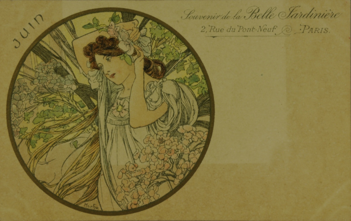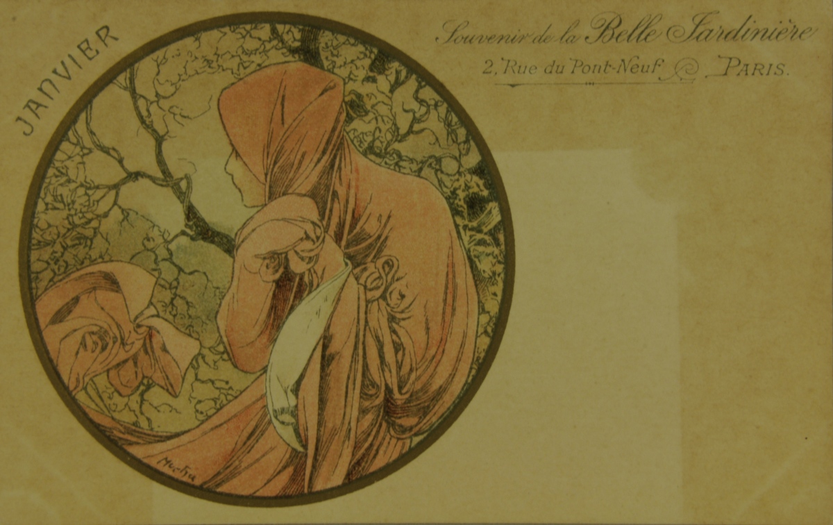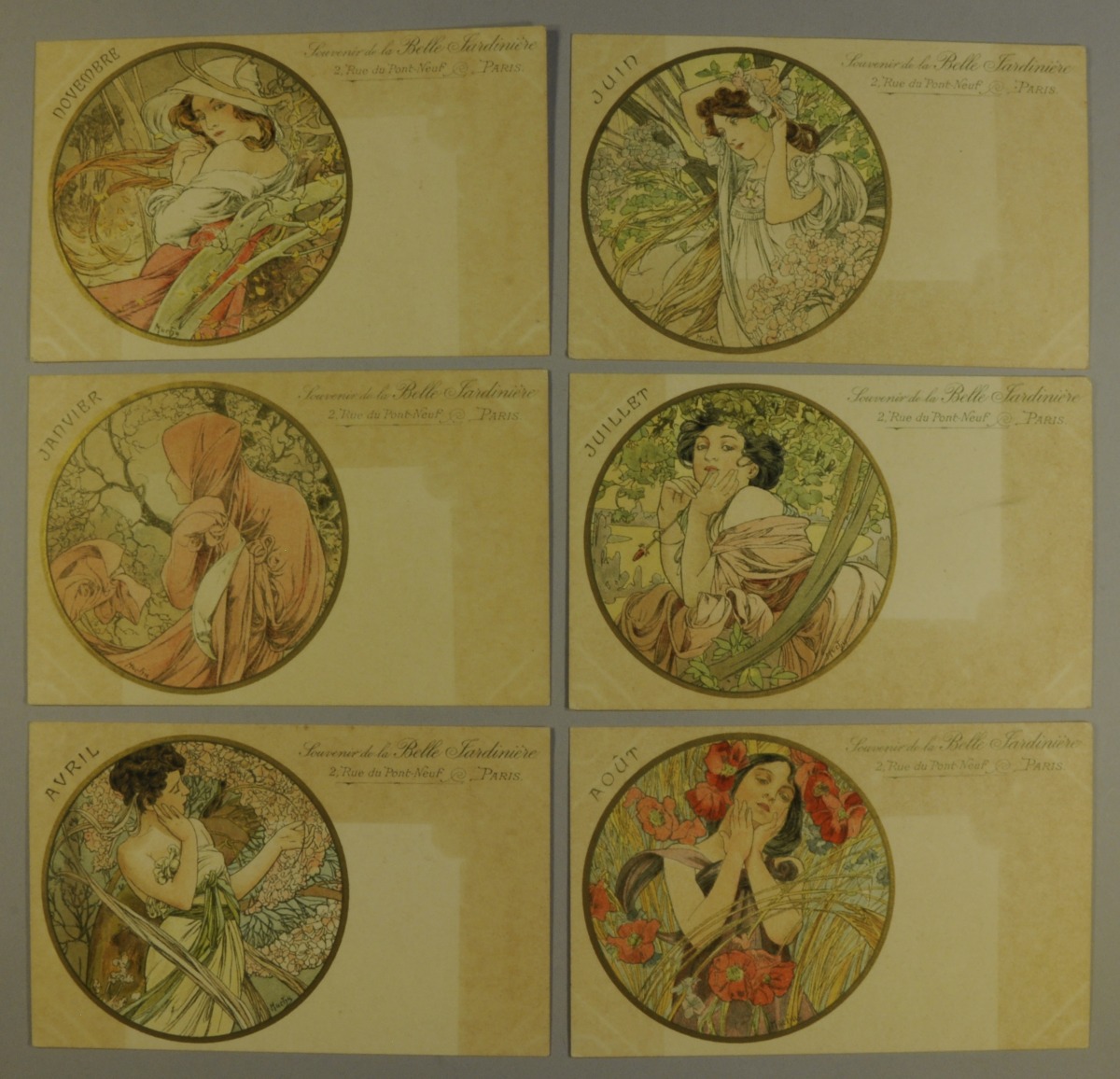 Série de 6 cartes postales en chromolithographie "Souvenir de la Belle Jardinière", des mois de janvier, avril, juin, juillet, août, novembre. Signées Mucha dans la planche. Imp. F. CHAMPENOIS, PARIS.