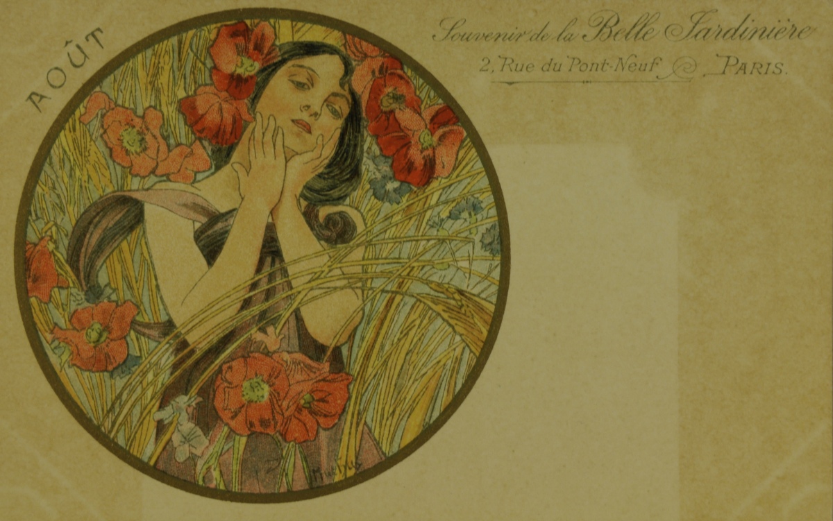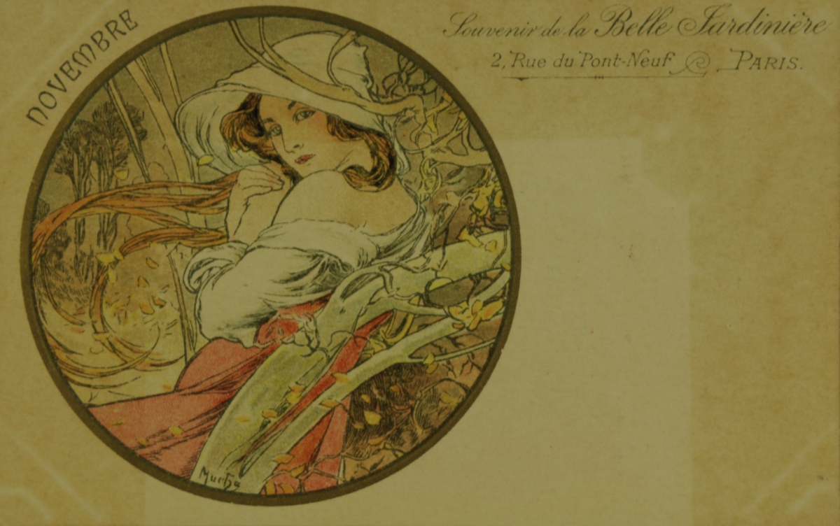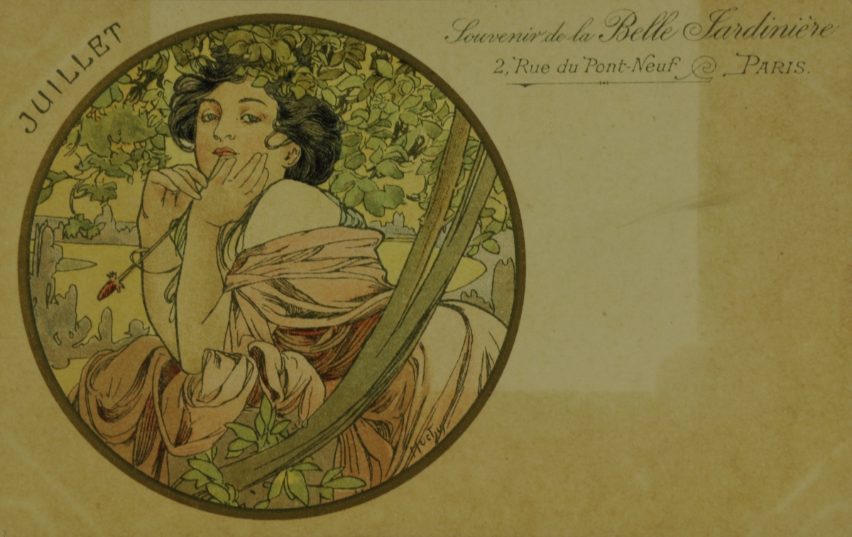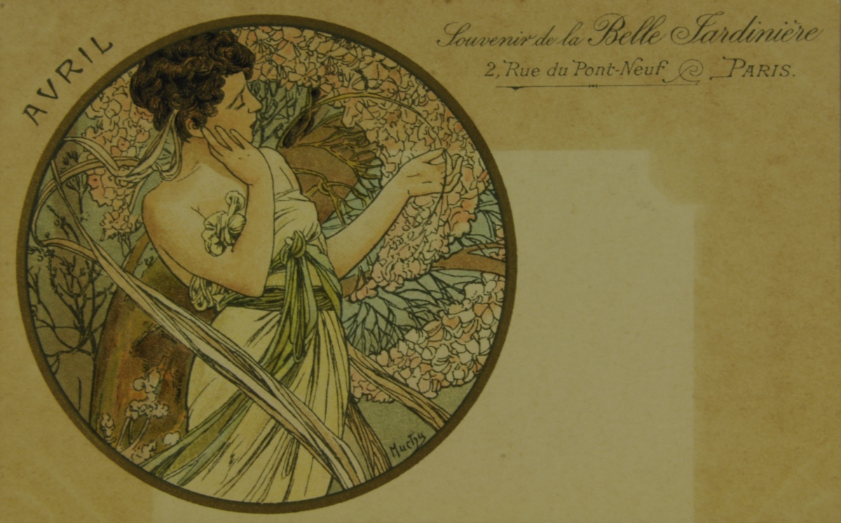 Série de 6 cartes postales en chromolithographie "Souvenir de la Belle Jardinière", des mois de janvier, avril, juin, juillet, août, novembre. Signées Mucha dans la planche. Imp. F. CHAMPENOIS, PARIS.