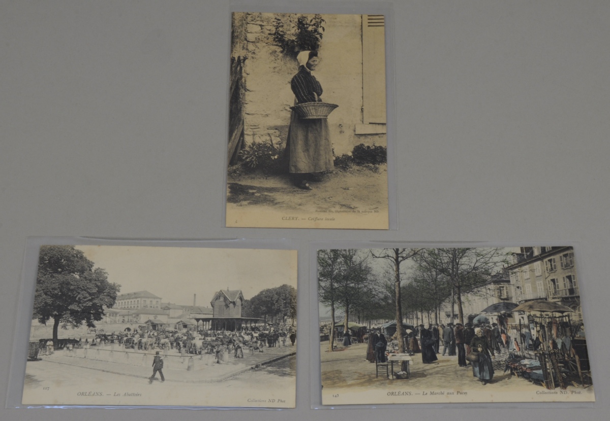 FRANCE, LOIRET. 3 CARTES POSTALES : Les abattoirs / Orléans. Le marché aux puces/ Cléry. Coiffure locale.