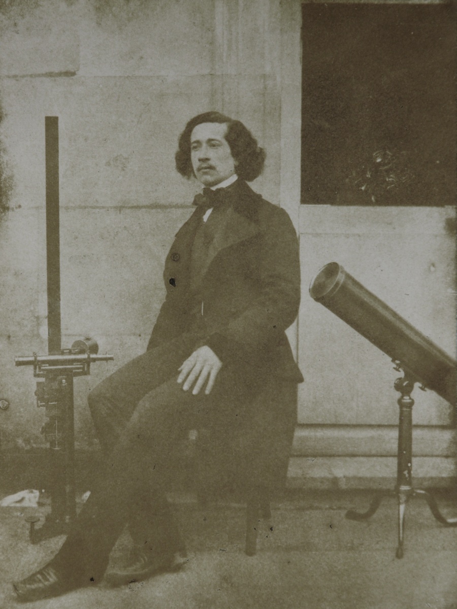 Jeune homme posant assis entouré d'instruments d'observation. Sujet rarement représenté.