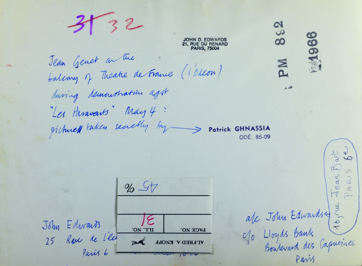 Jean Genet au balcon du Théâtre de France, durant la représentation des paravents, le 4 mai 1966