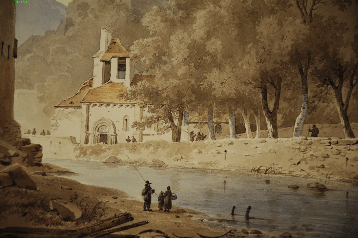Aquarelle signée et datée 1832, contrecollée et titrée sur une feuille.