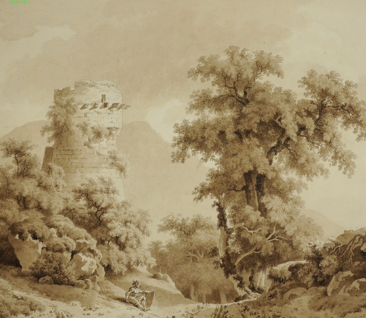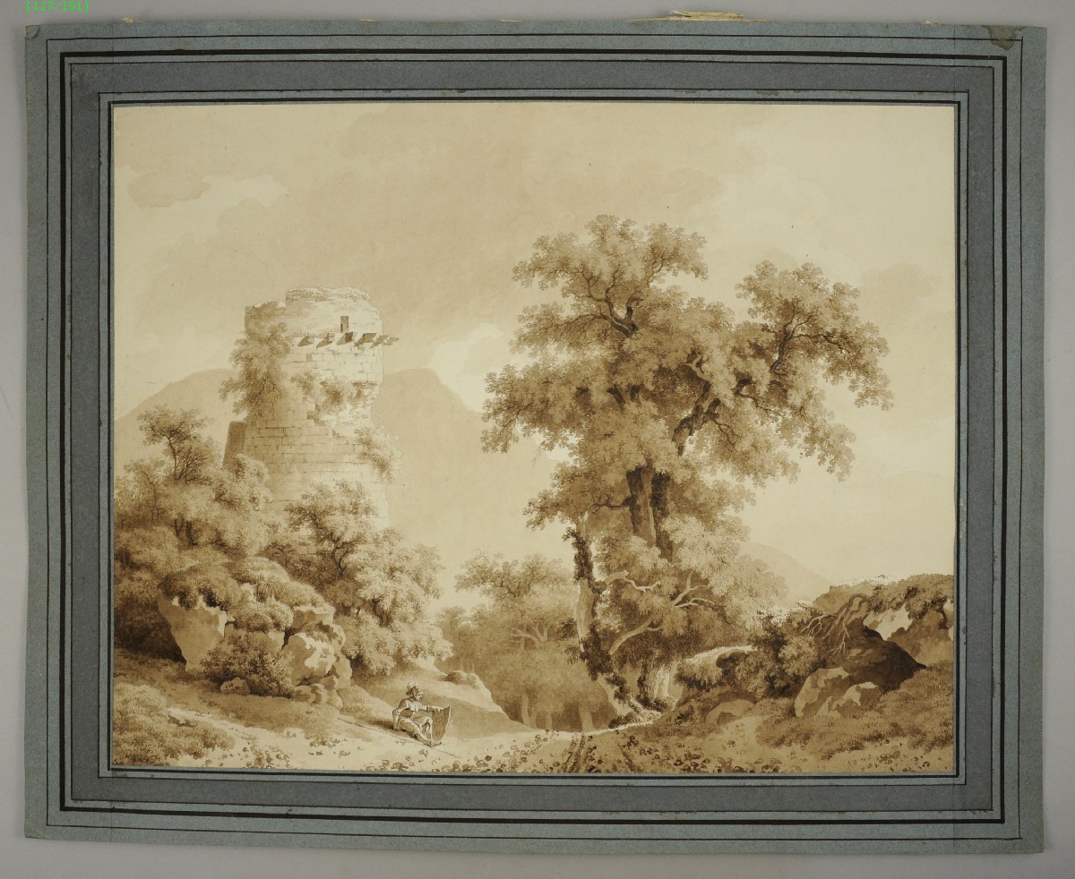 Encre brune et lavis, titrée au dos "La Tour de Roverea, sur un rocher près de Sex, de Topfer".