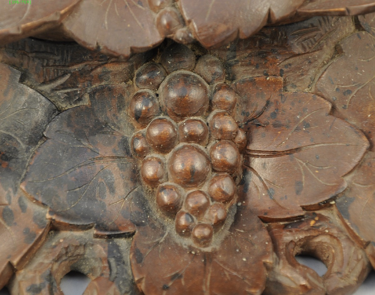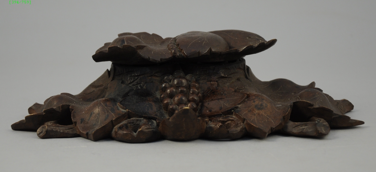 ÉCRITOIRE en noyer sculpté à décor de sarments et d'une grappe de raisins. Le couvercle découvre deux godets de verre.