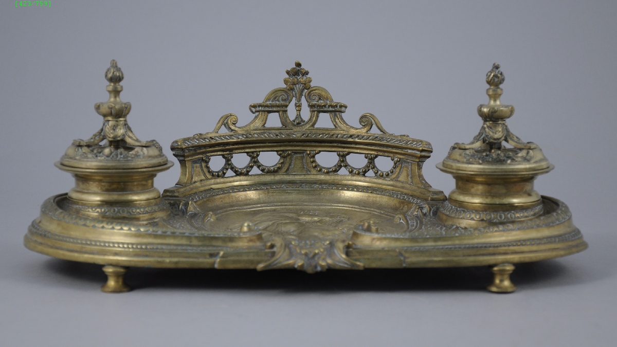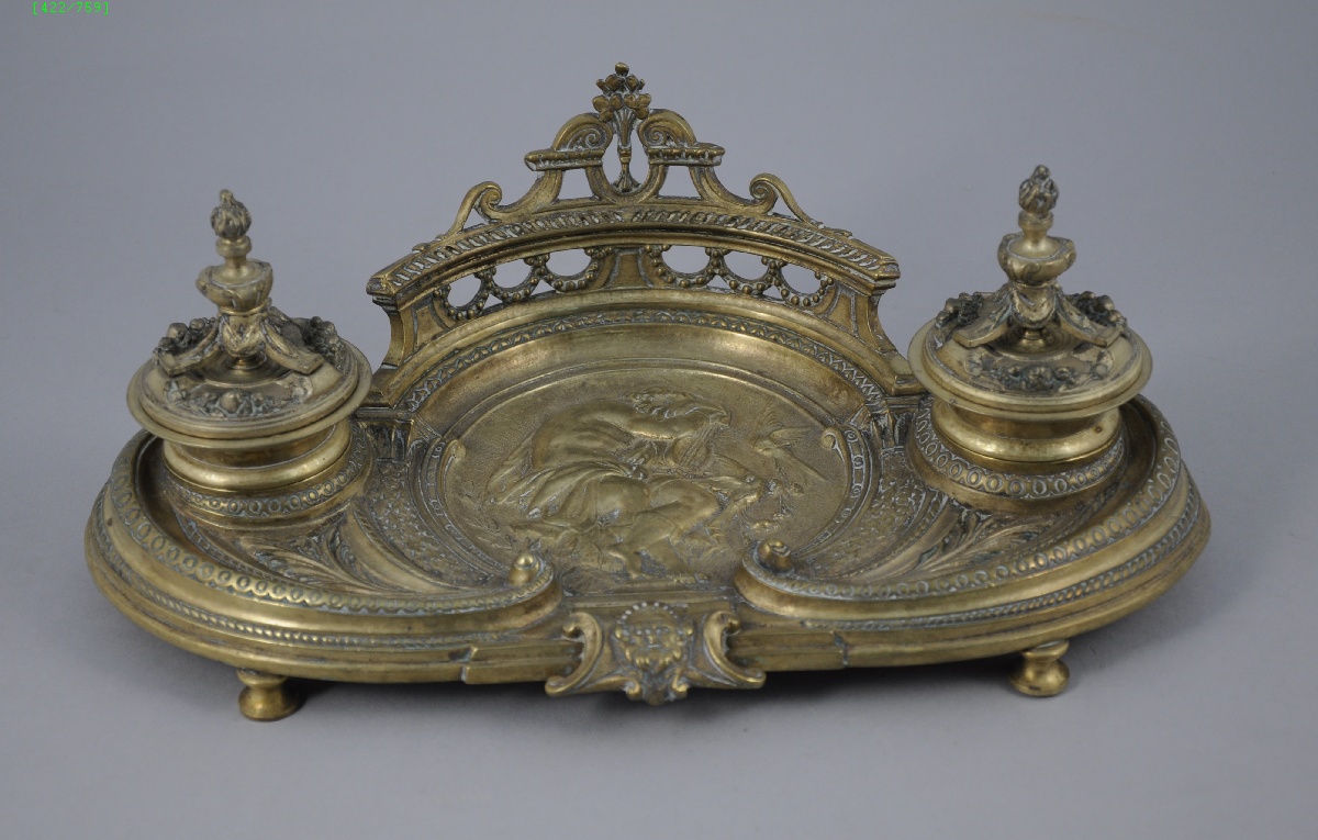ÉCRITOIRE en bronze. Il est orné au centre d'un décor en relief figurant un homme appuyé sur sa lyre (Apollon ?) et accompagné d'oiseaux. De part et d'autre, deux godets avec couvercles ornés de pots à feu. Sur le devant, mascaron grotesque sur fond de cuirs découpés.