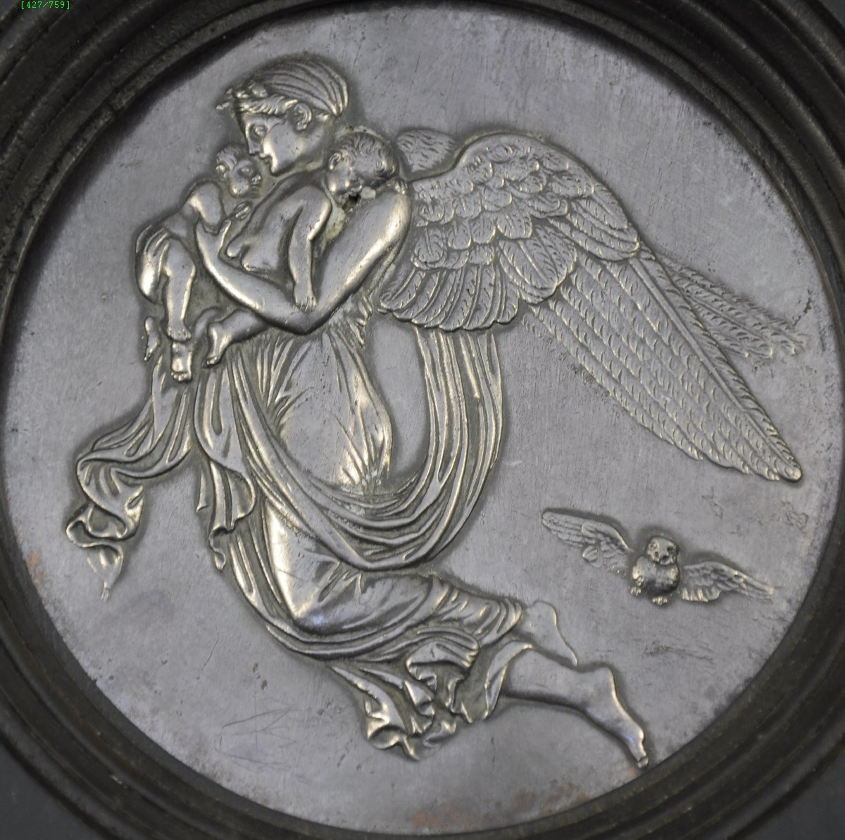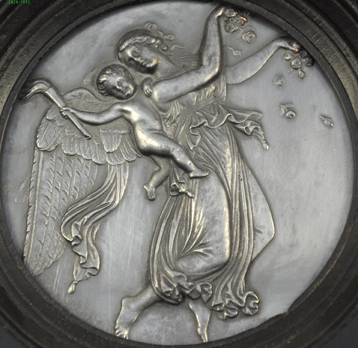 PAIRE de MÉDAILLONS circulaires en étain représentant pour l'un une figure ailée portant deux enfants accompagnés d'une chouette, et pour l'autre une figure ailée jetant des roses et portant un amour.