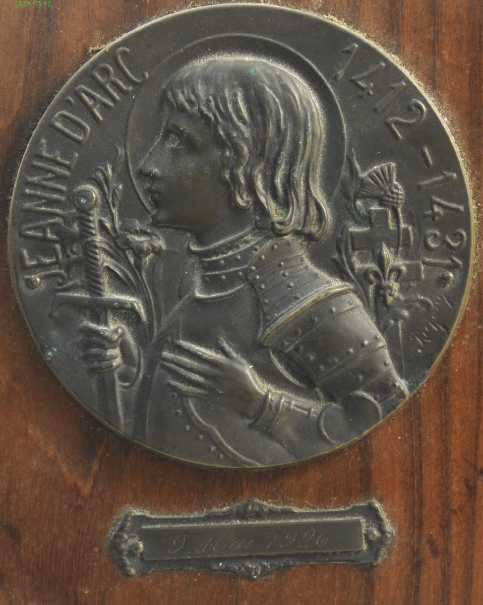 Joint : Médaillon en laiton figurant Jeanne d'Arc, avec un cartel inscrit "9 mai 1926", sur une plaquette de bois exotique à filets de cuivre. 14 x 13 cm.