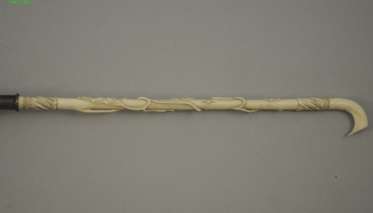 OMBRELLE à manche repliable en ivoire, sculpté de feuilles et de glands, entre deux bordures de godrons torses. Marquée La Vaissière Buisneau sur une bague de métal.