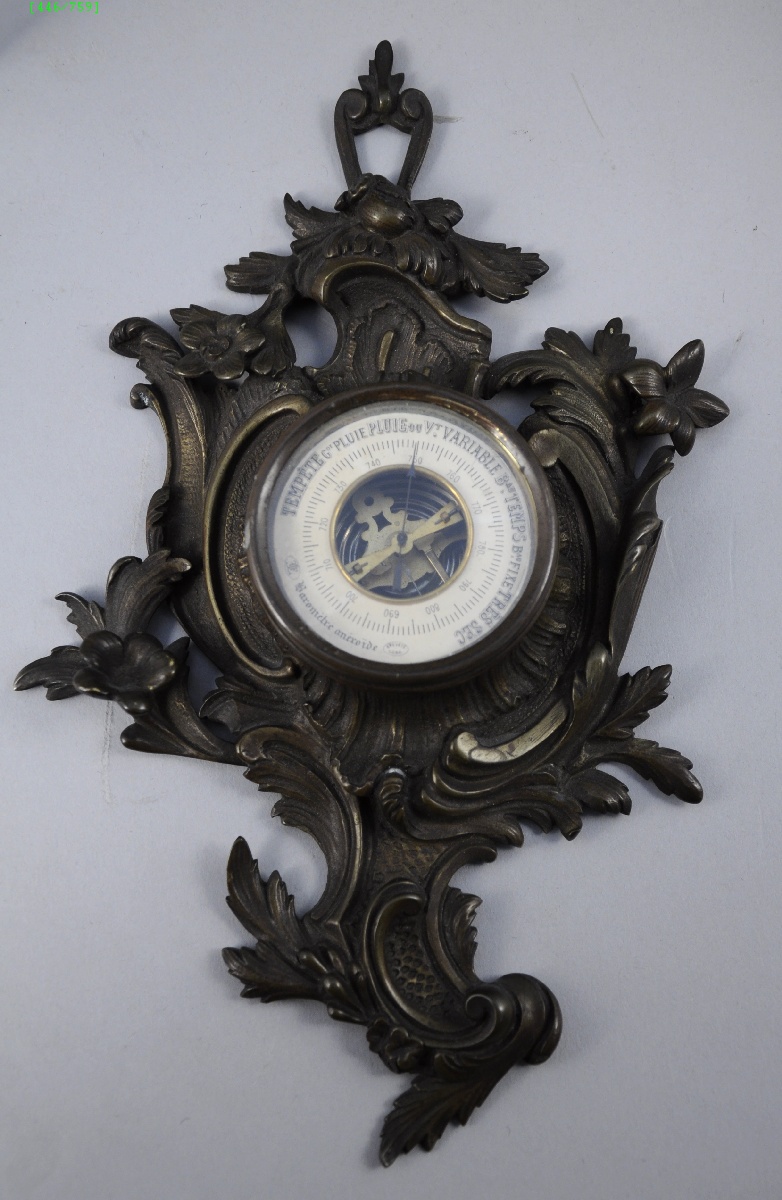 -Un BAROMÈTRE. Cadre de bronze à ornementation rocaille de feuilles, agrafes et fleurs. Style Louis XV, déb XXe. Haut. 25 cm.