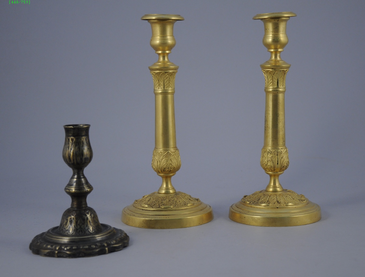 Joint : CHANDELIER en laiton à décor de palmes et d'entrelacs et à piédouche contourné. Haut. 14 cm.
