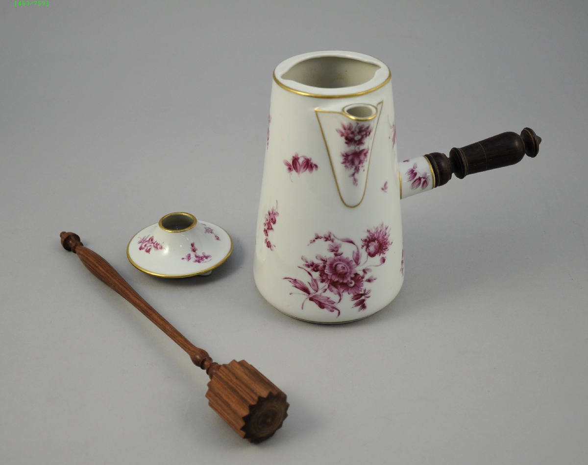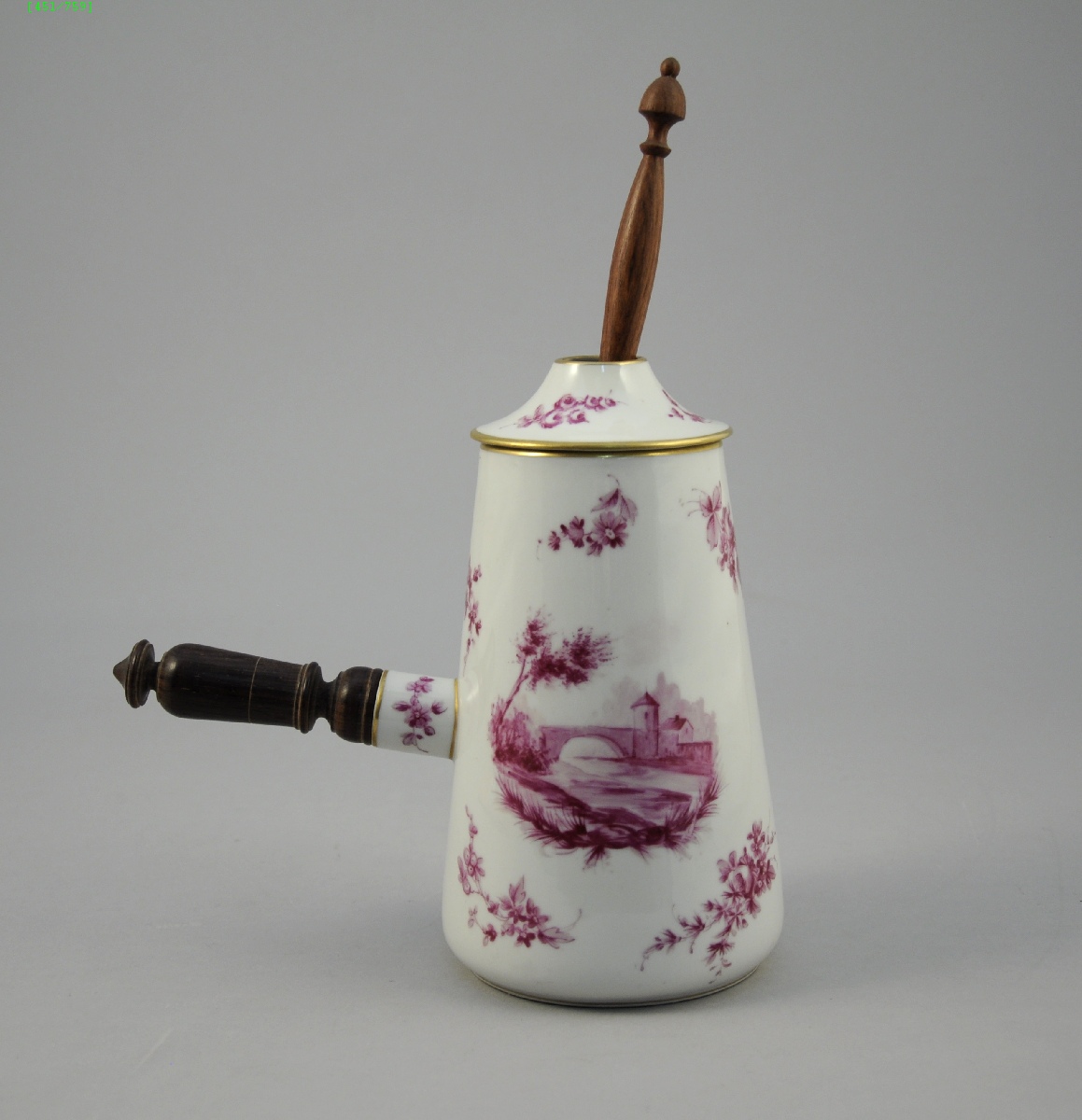 CHOCOLATIÈRE en porcelaine à décor en camaïeu rose de semis de fleurs et d'un paysage avec un pont. Couvercle et bec verseur soulignés de filets dorés. Manche et moussoir en bois tourné.