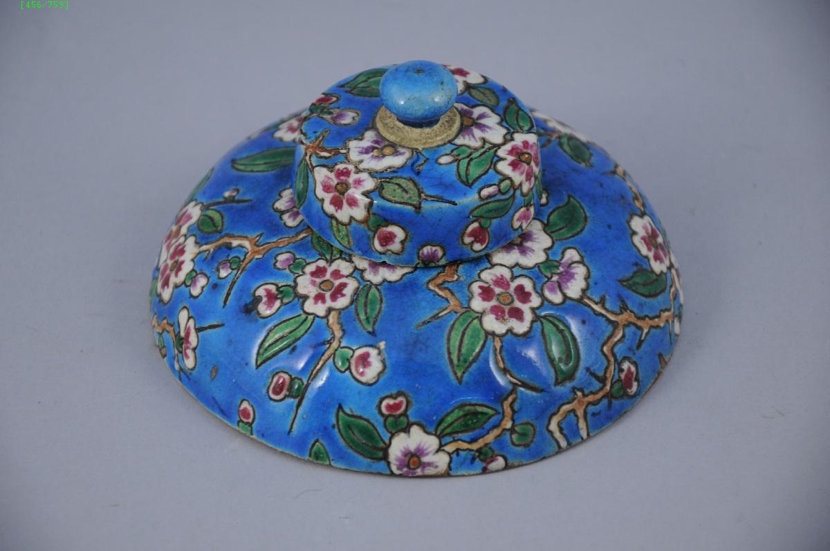 LONGWY. ENCRIER rond "presse-papier" avec couvercle, à décor d'émaux cloisonnés figurant des branches fleuries sur fond bleu.
