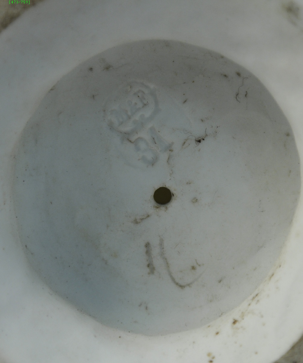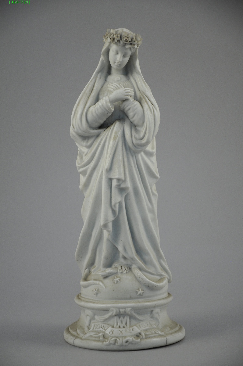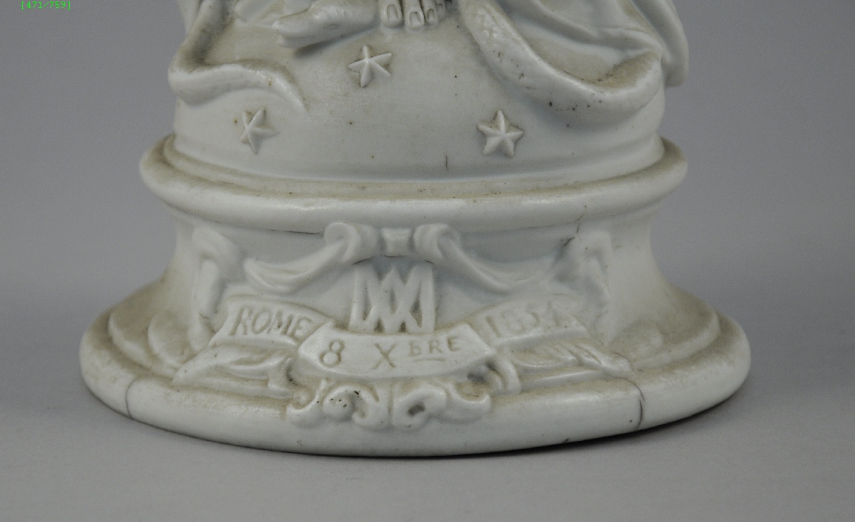 LIMOGES. Vierge en biscuit de porcelaine, sur piédouche évasé, marqué "Rome 8 Xbre 1854". Marque en creux sous le piédouche "M et F 31".