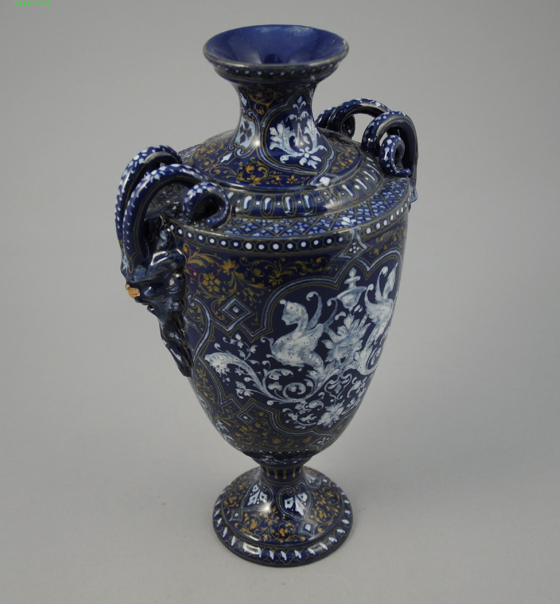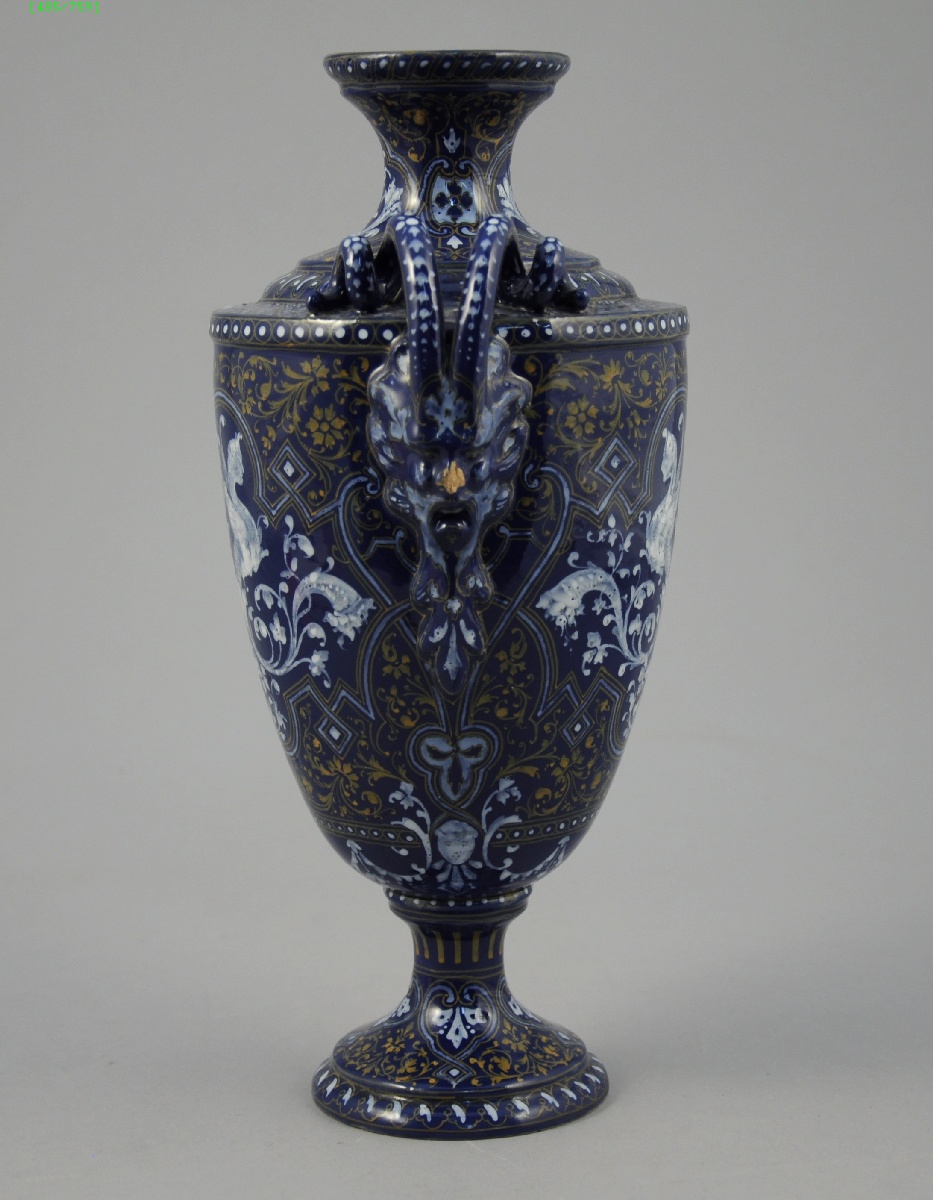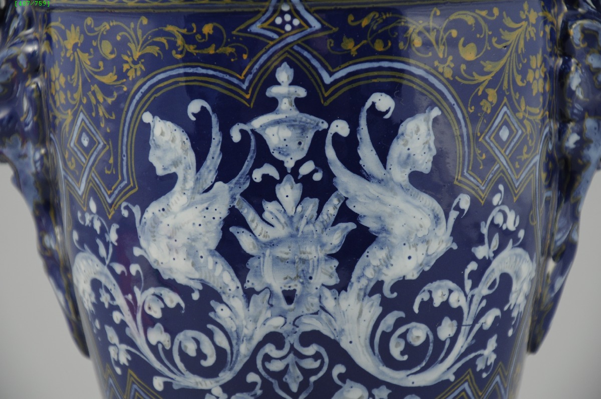 J. TORTAT À BLOIS. VASE ovoïde en faïence émaillée bleue reposant sur un petit piédouche. De part et d'autre, anses en forme de mascarons cornus. Décor en blanc fixe de chimères de part et d'autre d'un masque feuillagé sur la panse, et de rinceaux jaunes.