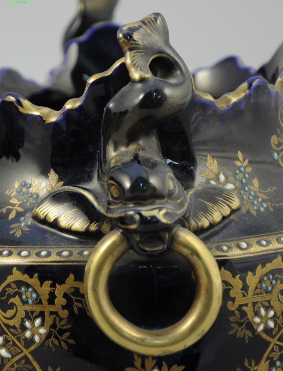 GIEN. Paire de VASES en faïence fine. Anses en forme de dauphins tenant des anneaux. Bordure échancrée. Petits pieds à enroulement feuillagés. Décor sur fond bleu profond d'entrelacs et de feuillages dorés, et de petites fleurs en émail blanc ou turquoise.