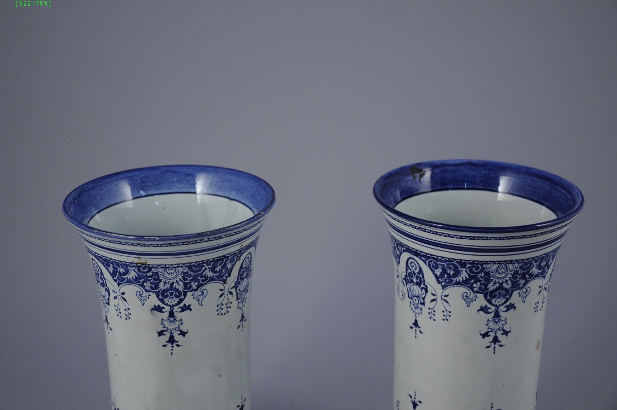 GIEN. Paire de VASES rouleaux en faïence fine, à décor imprimé en camaïeu bleu de lambrequins.