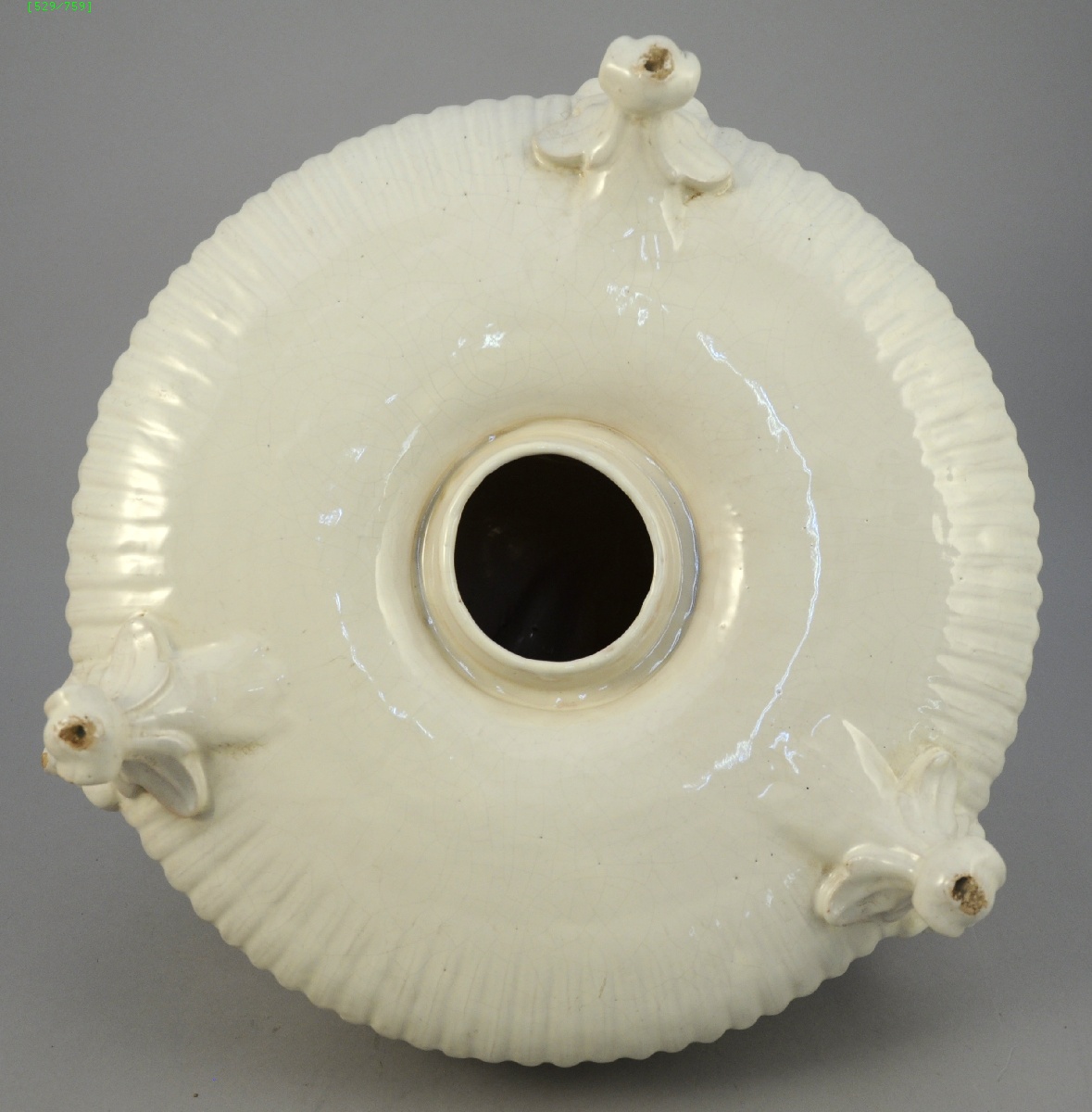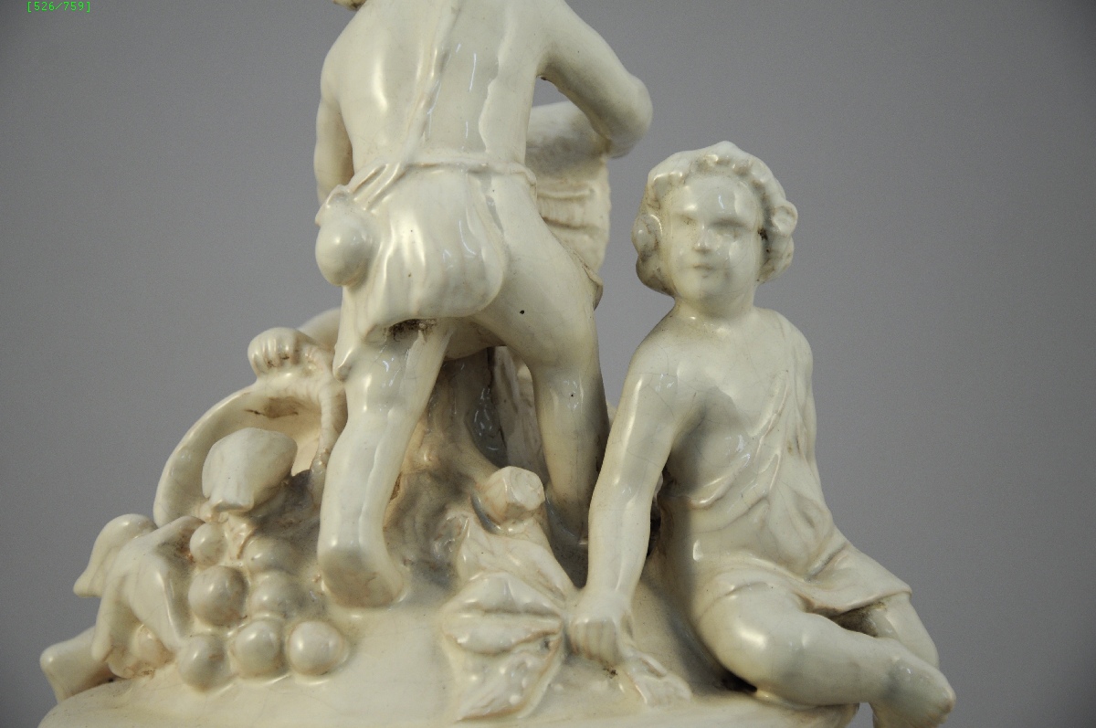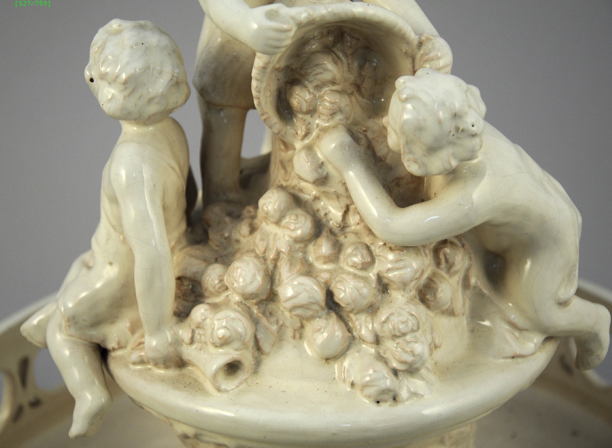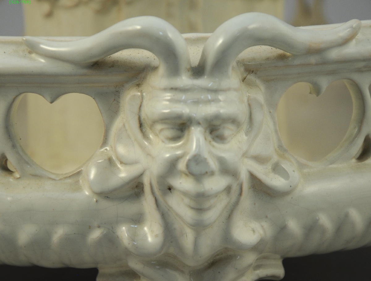 SURTOUT de table tripode en faïence blanche. Il est animé au centre, sur une colonne, par un groupe de putti vidant une corbeille de fleurs. Pieds surmontés de masques cornus. Sur la bordure, ajours en forme de curs.