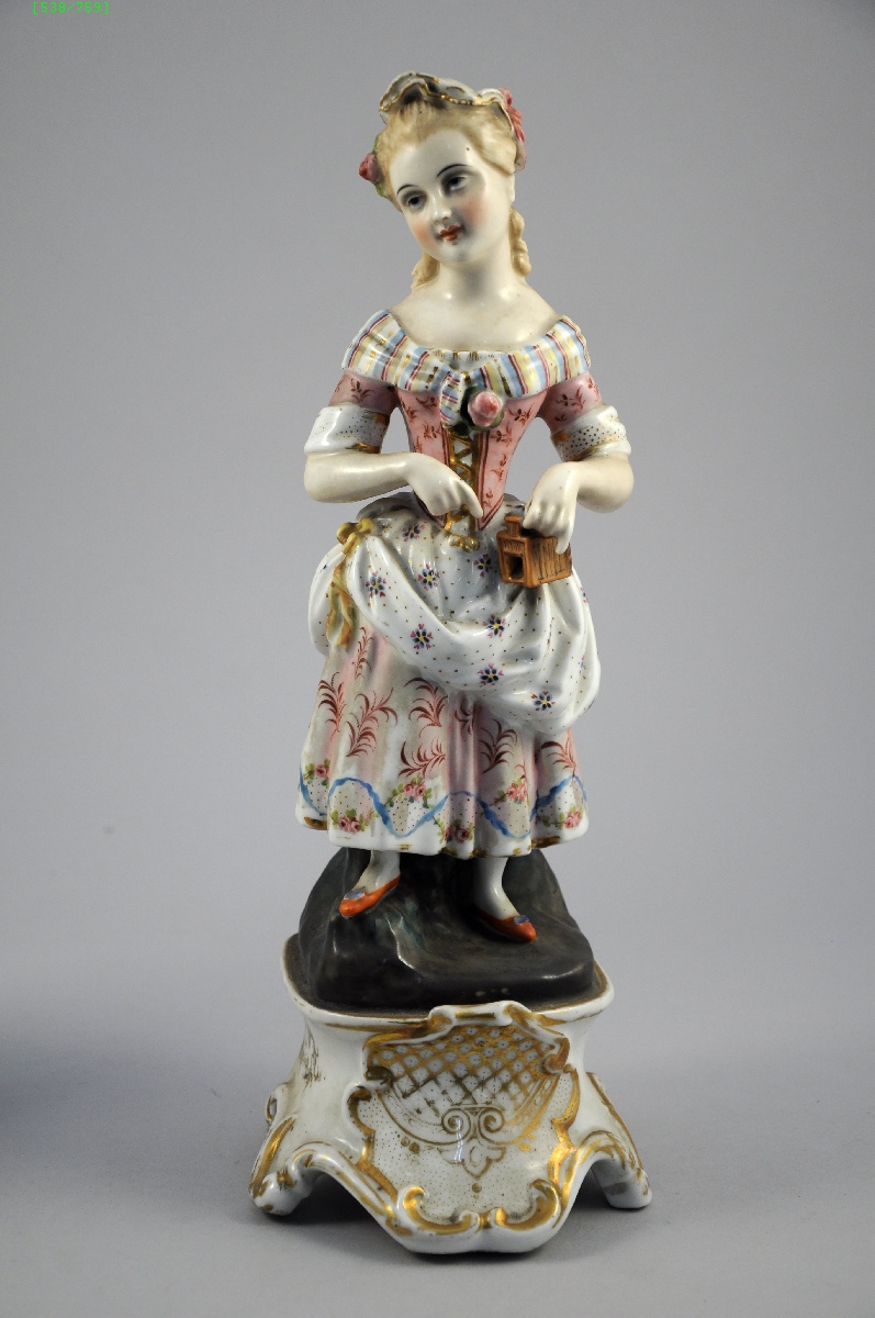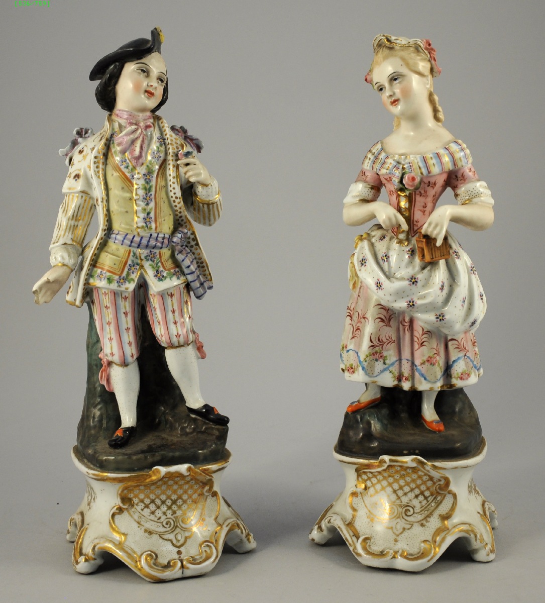 Deux SUJETS en porcelaine polychrome, figurant un couple de jeunes courtisans. La femme tient une cage ouverte ; l'oiseau qui y était enfermé s'est posé sur la main gauche de l'homme. Terrasses de porcelaine blanche à décor doré de croisillons et de volutes.