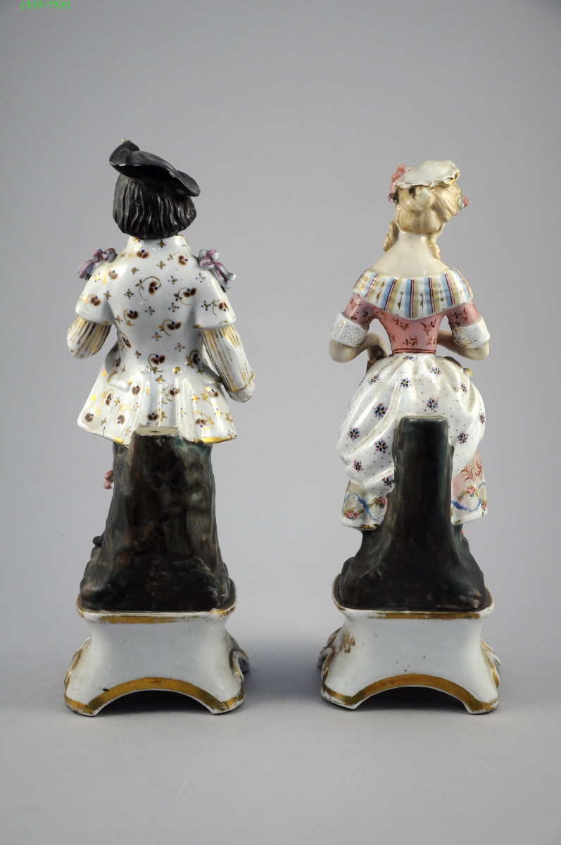 Haut. 39 et 40 cm. (main droite de l'homme recollée et petits manques à cette main, tête de l'oiseau manquante)