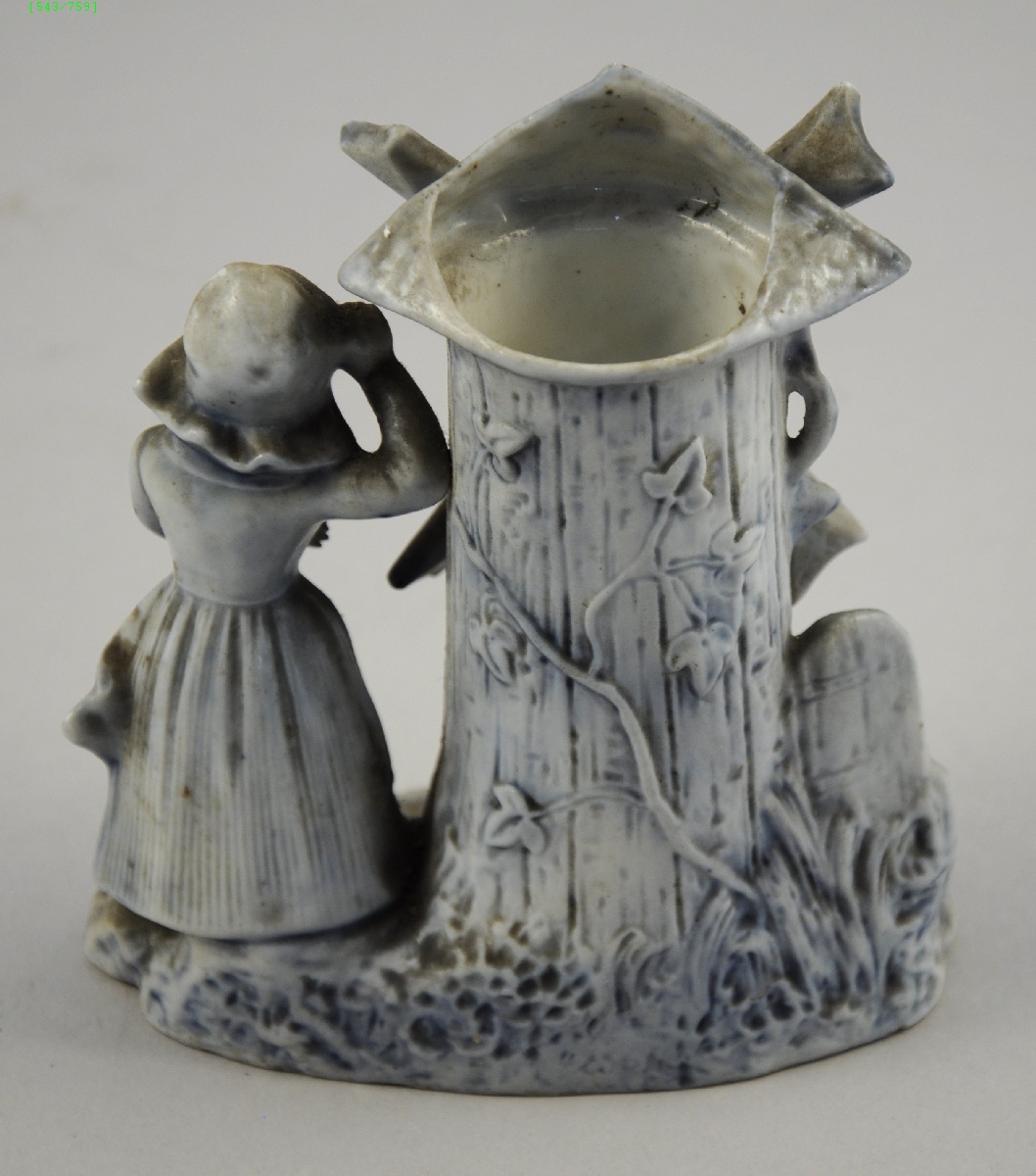 PORTE-BOUQUET en porcelaine blanche à rehauts bleus, figurant une fillette près d'un moulin.