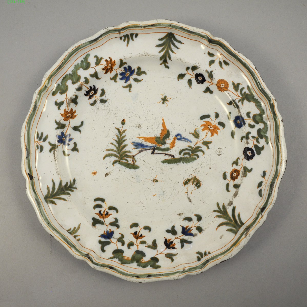 MOUSTIERS. Deux ASSIETTES à bords contournés en faïence stannifère à décor en polychromie de grand feu, pour l'une d'un échassier courant et de tiges fleuries, et pour l'autre de fleurs de solanées.