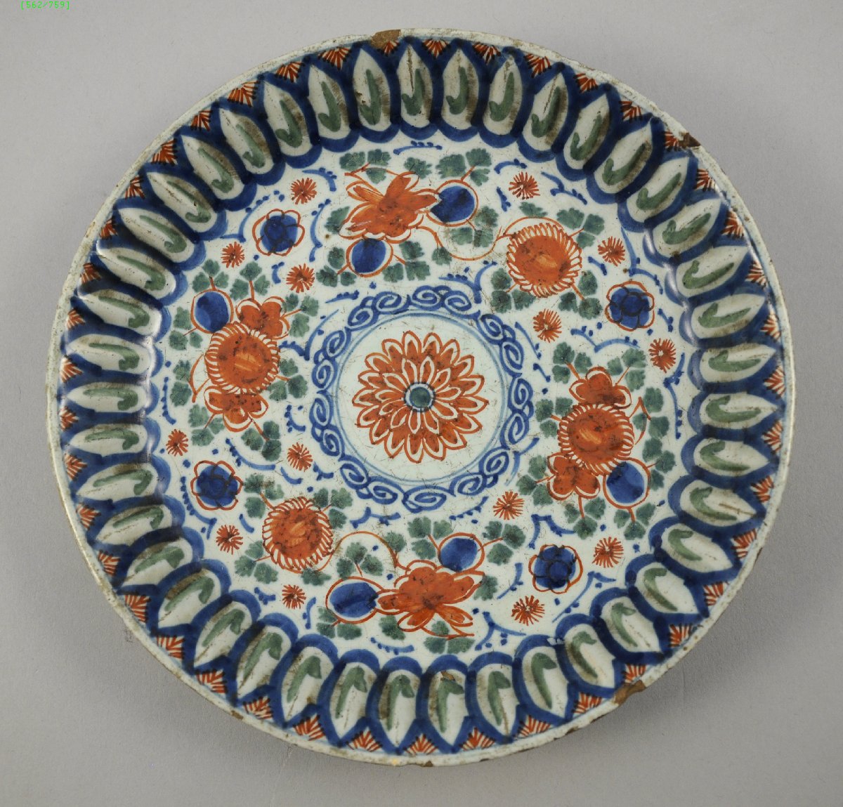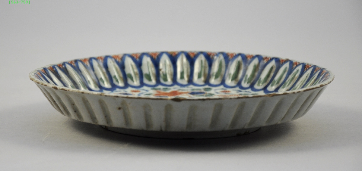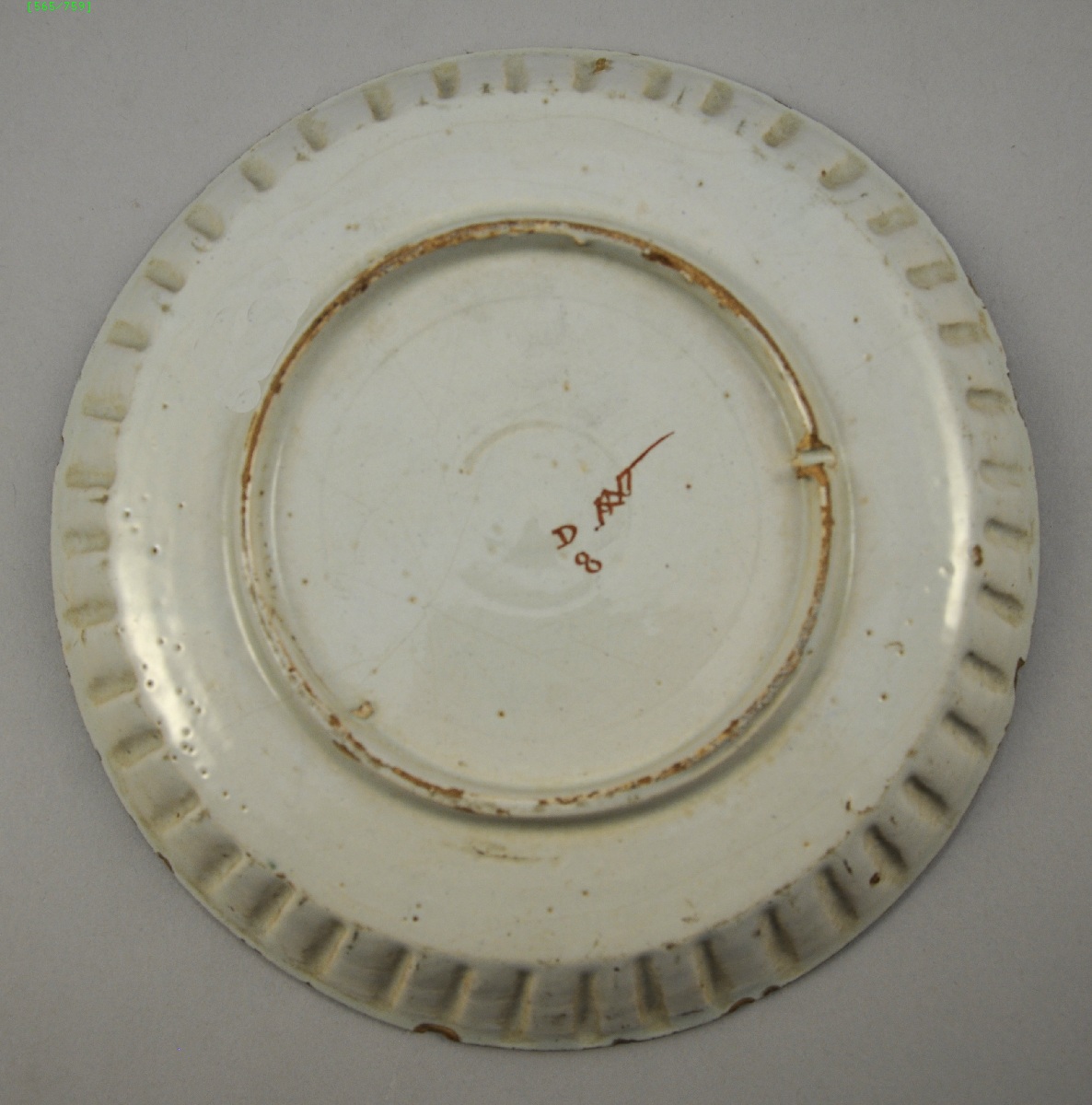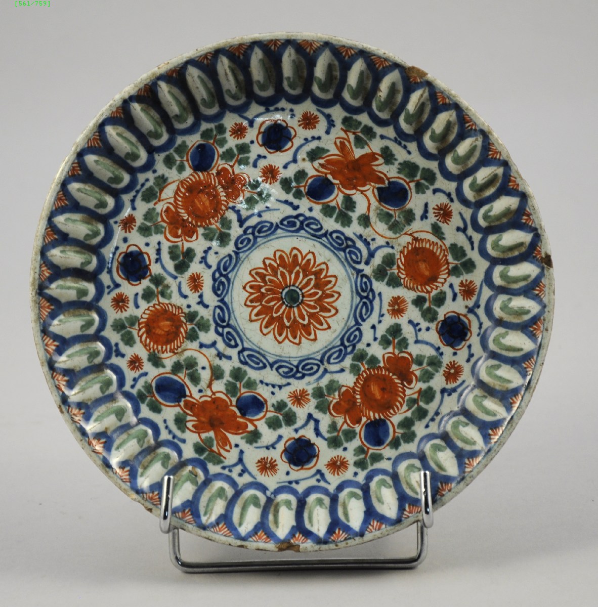 DELFT. Petite coupe en faïence stannifère. Bordure godronnée. Décor floral stylisé en polychromie de grand feu. Au revers, marque "D.8" et monogramme non identifié.