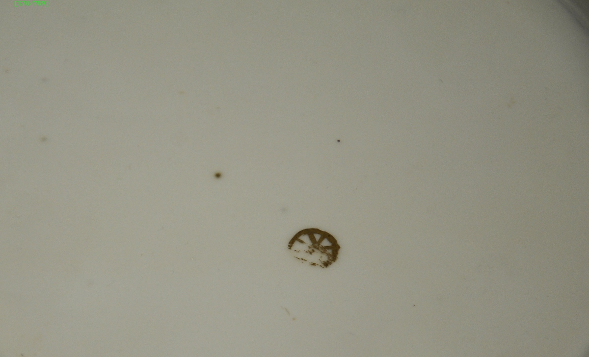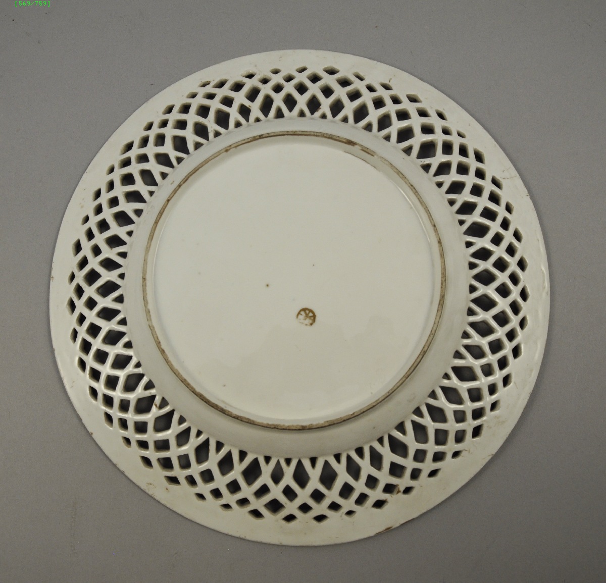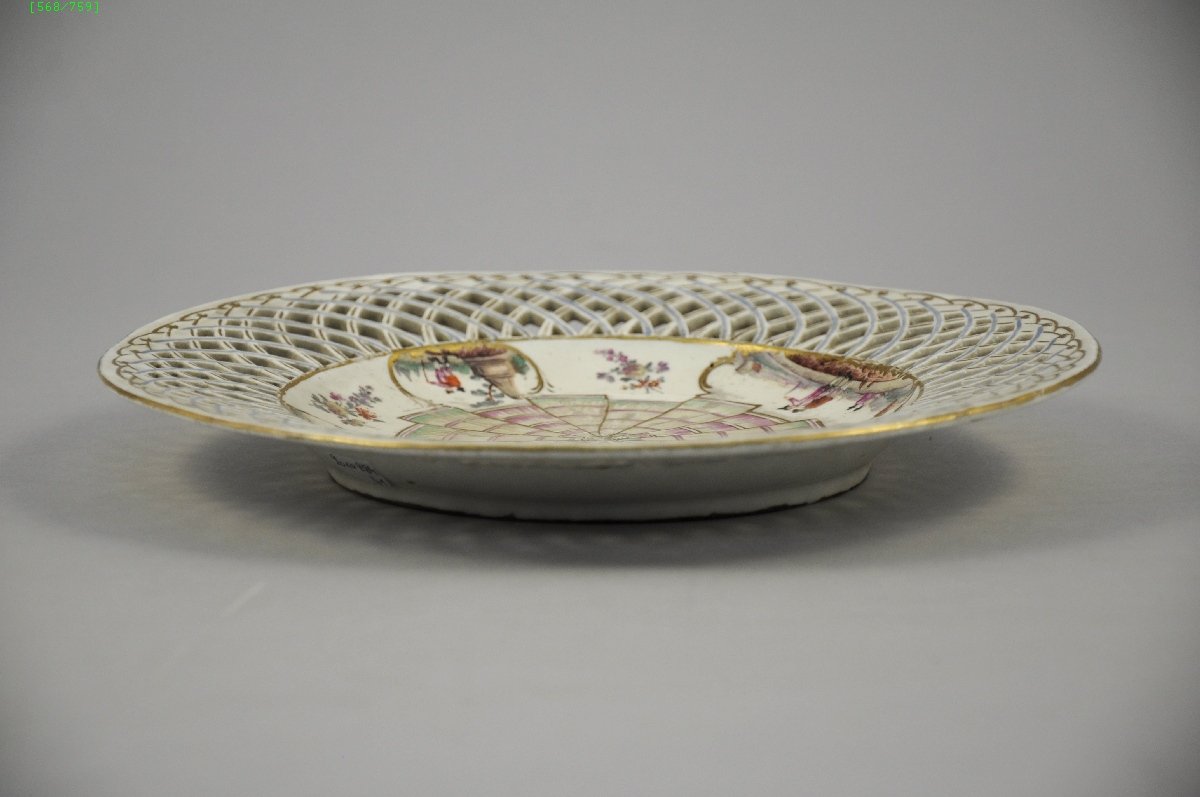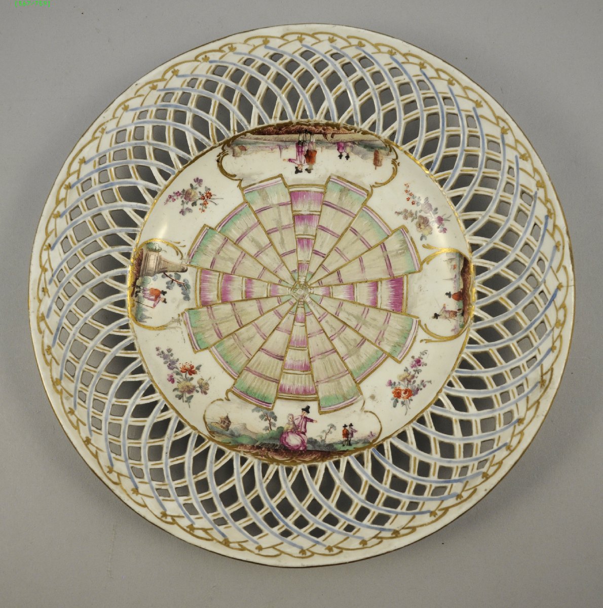 ASSIETTE en faïence stannifère à décor polychrome de petit feu, figurant un motif rayonnant au centre et quatre scènes animées dans des réserves, alternant avec des semis de fleurs. Aile ajourée à l'imitation de la vannerie.