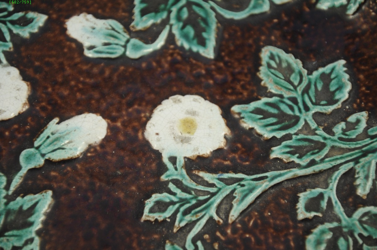 Grand VIDE-POCHE de forme carrée en faïence fine à décor d'émaux colorés, dite "barbotine". Motif de fleurs blanches en relief sur fond brun, et d'un ruban bleu enserrant les tiges sur le rebord.