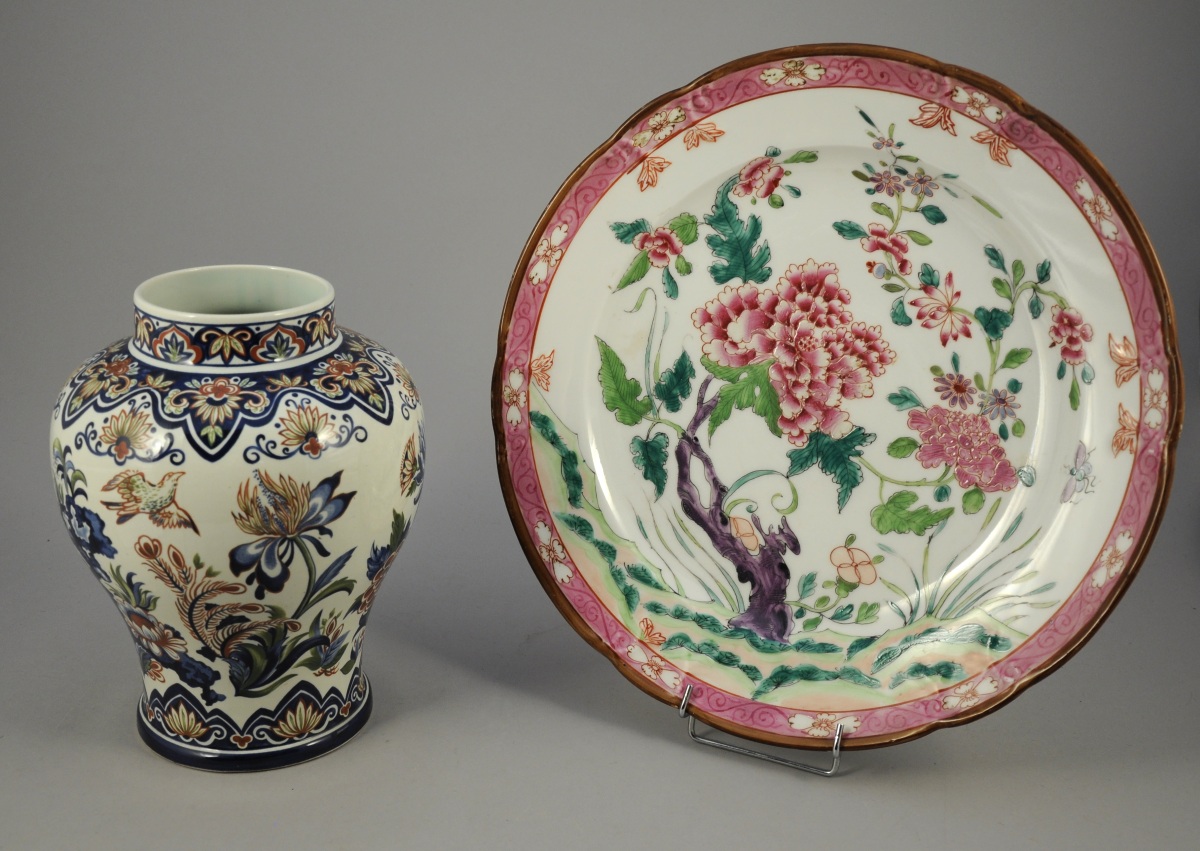 Joint : Un PLAT circulaire en porcelaine à décor polychrome dans le goût de la "Famille rose". XXe. Diam. 40 cm.