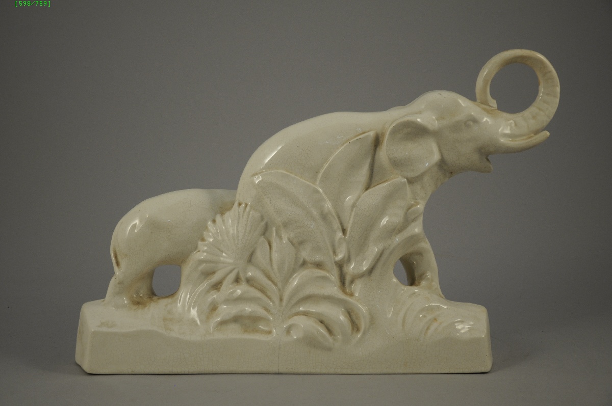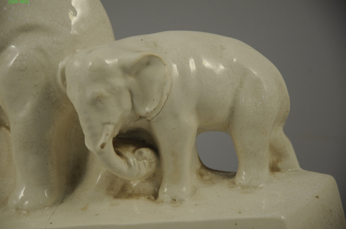 ÉLÉPHANT et son petit. Groupe en faïence blanche craquelée, marqué L. FRANÇOIS en relief. Vers 1930.