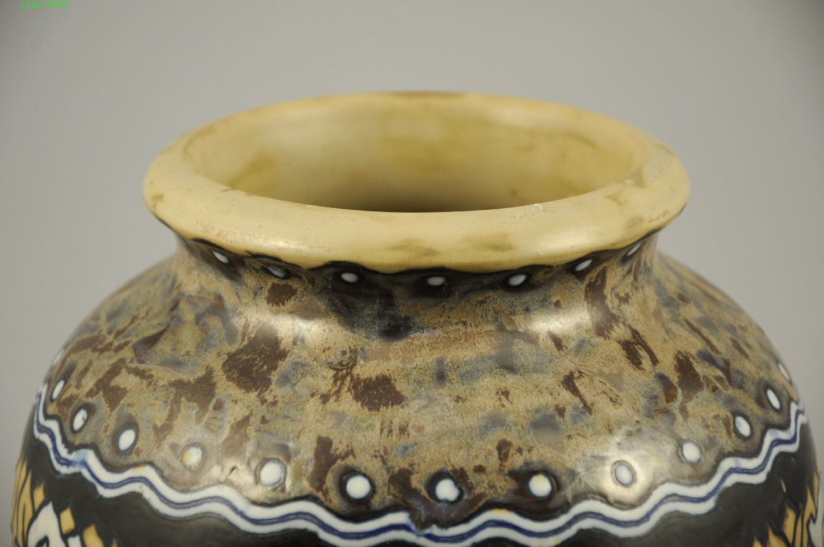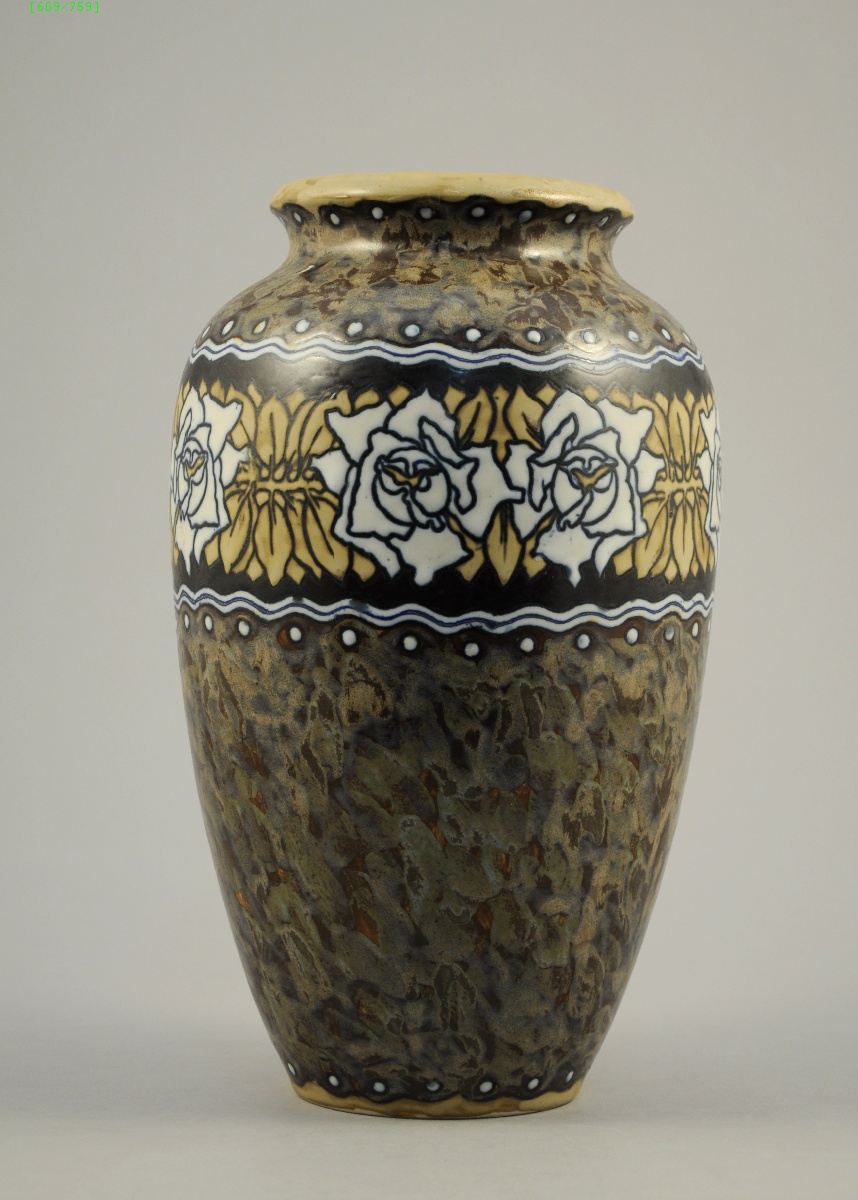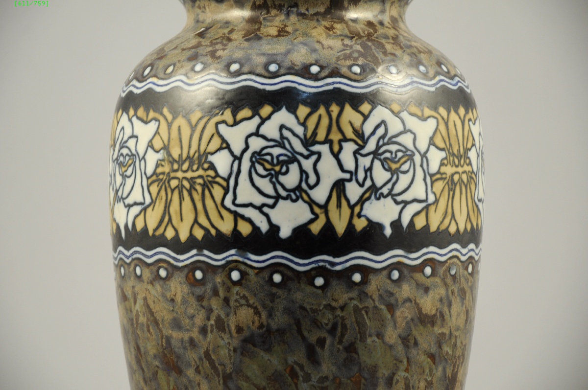 KERAMIS (Royal Boch). VASE balustre en grès à décor d'une frise de fleurs blanches et de feuilles jaunes sur fond brun.