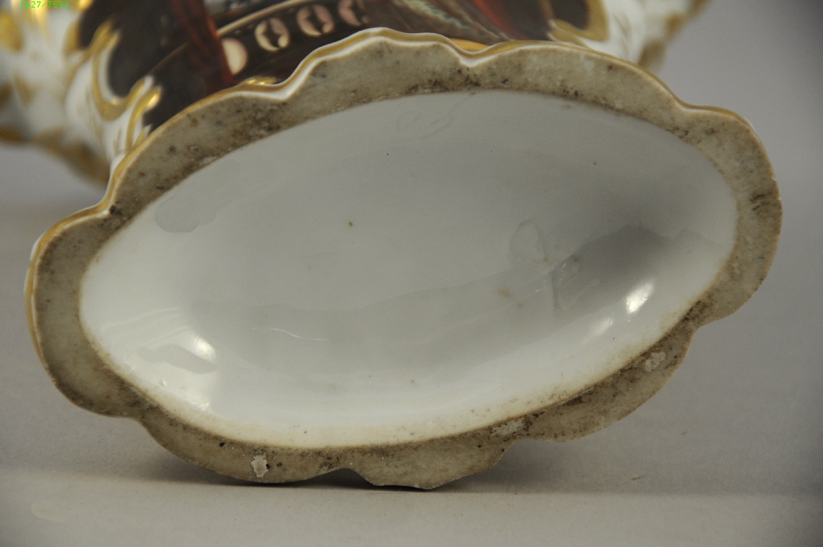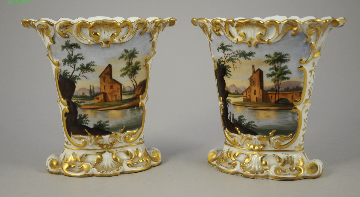 LIMOGES ou PARIS ? Paire de vases en porcelaine. Décor en relief de coquilles et feuillages rehaussés à l'or. Ils sont ornés de scènes galantes d'esprit troubadour, représentant un chevalier et sa dame, en haut de remparts et au balcon d'un château. De l'autre côté sont représentés des paysages lacustres.