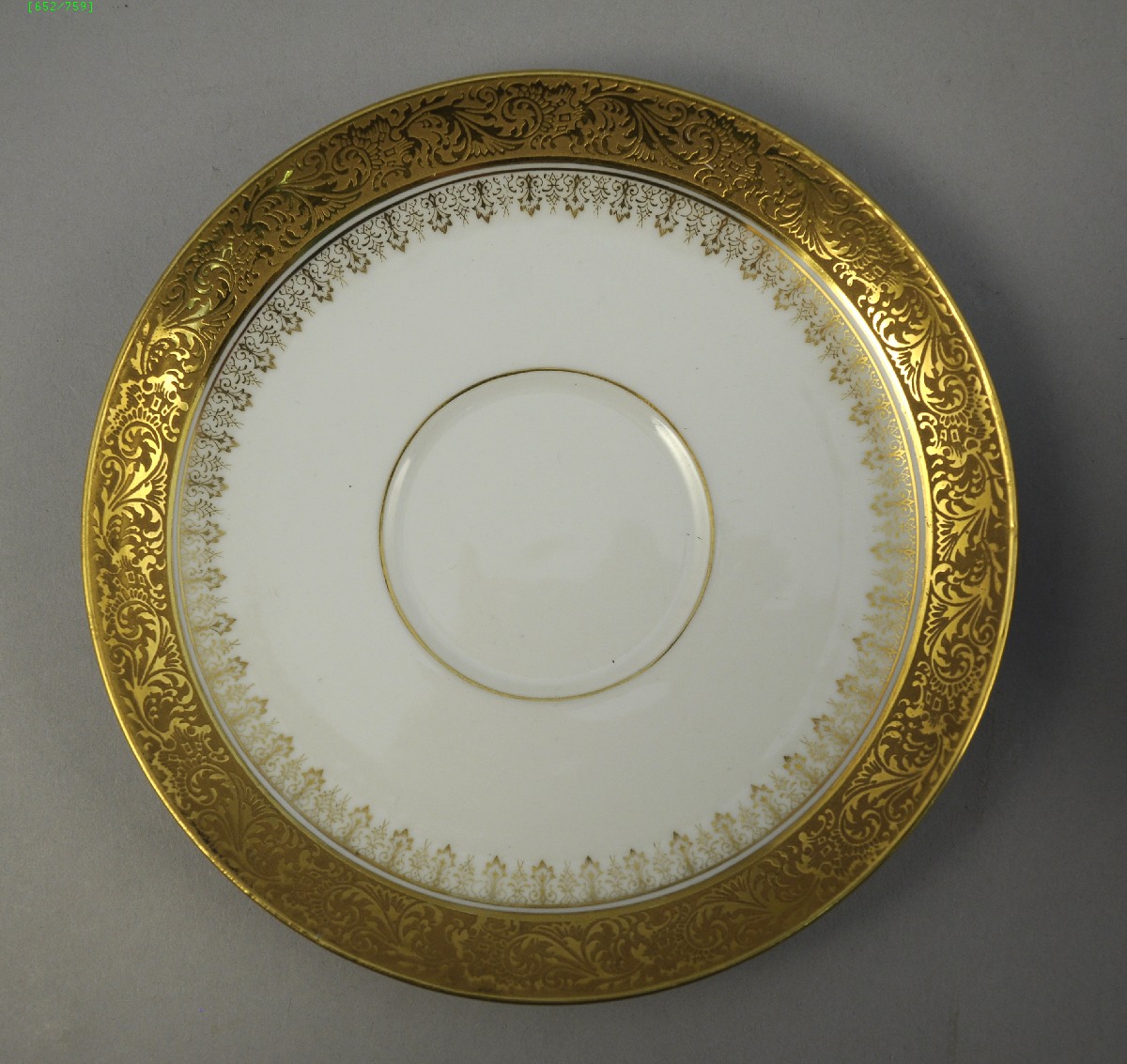 LIMOGES. Deux déjeuners en porcelaine blanche, à décor de filets et de rinceaux dorés.