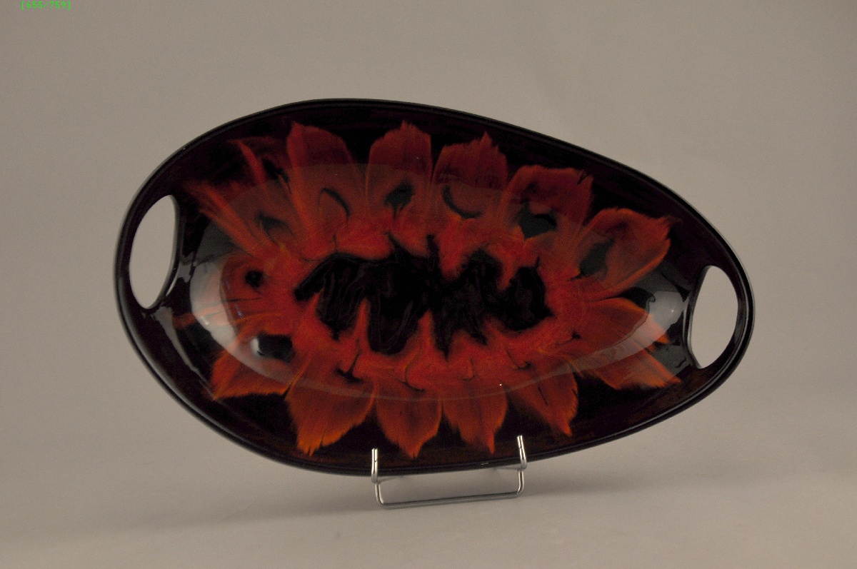 VALLAURIS (?). COUPE À OREILLES AJOURÉES en faïence noire ornée de pétales rouges.
