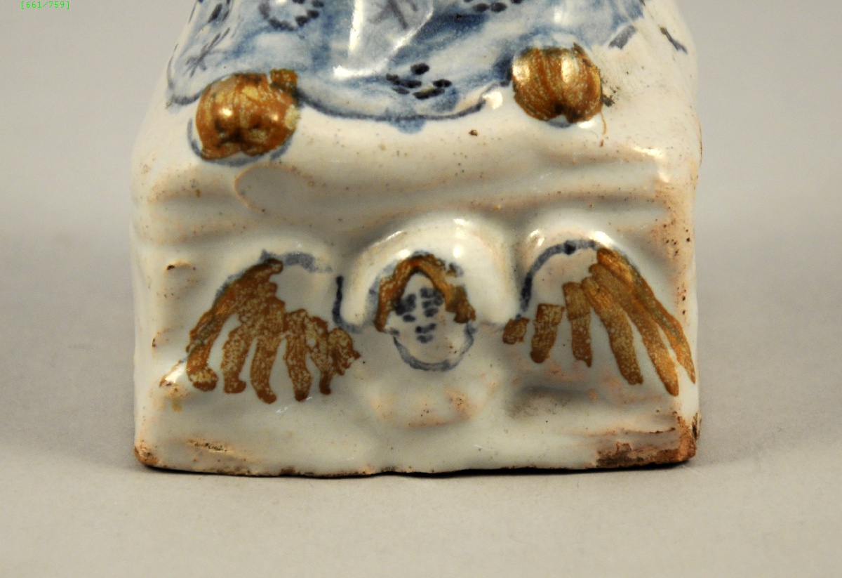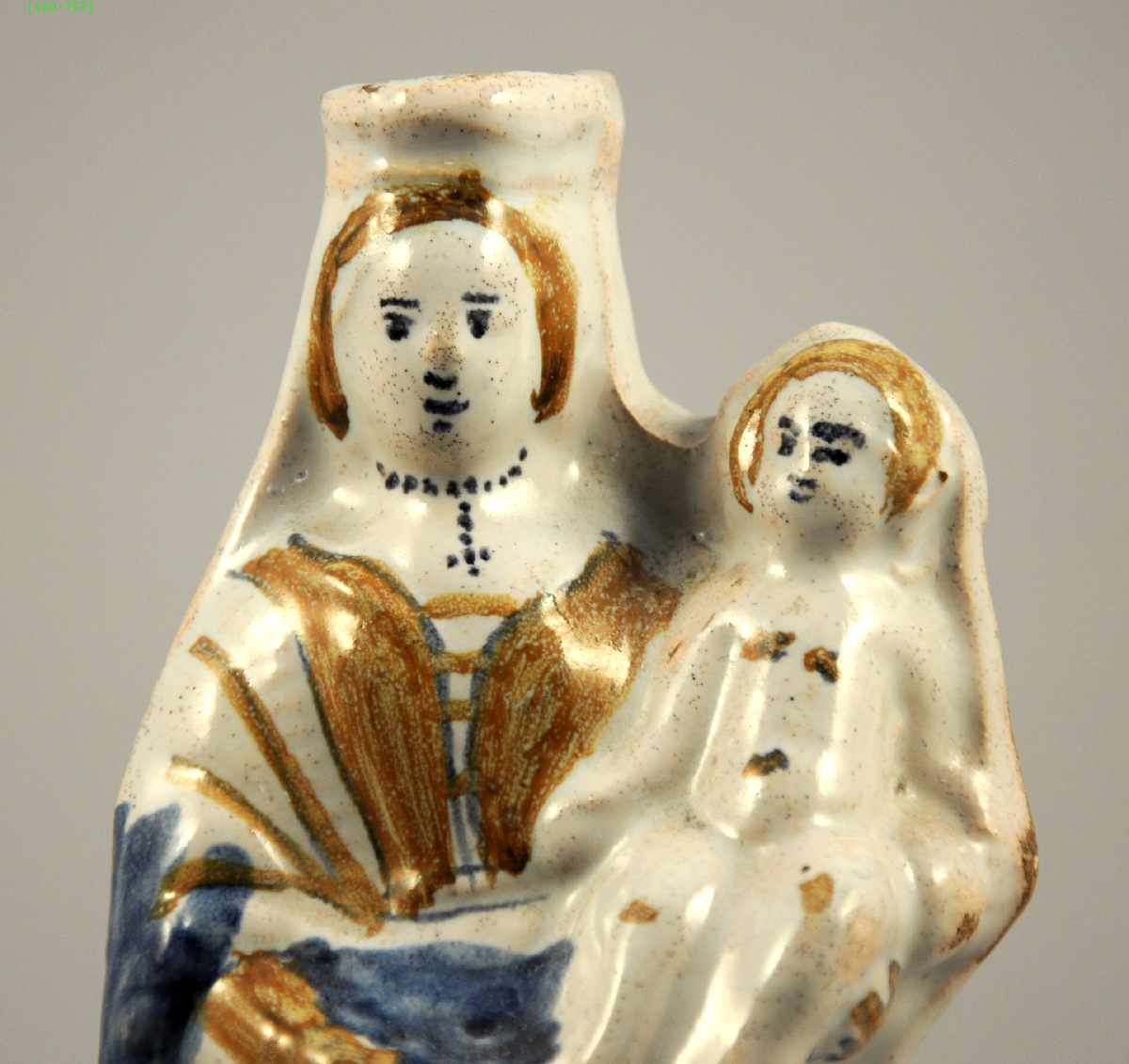 VIERGE D'ACCOUCHÉE en faïence stannifère à décor bleu et ocre de grand feu.