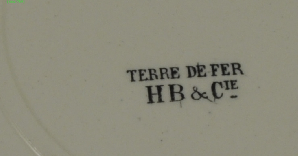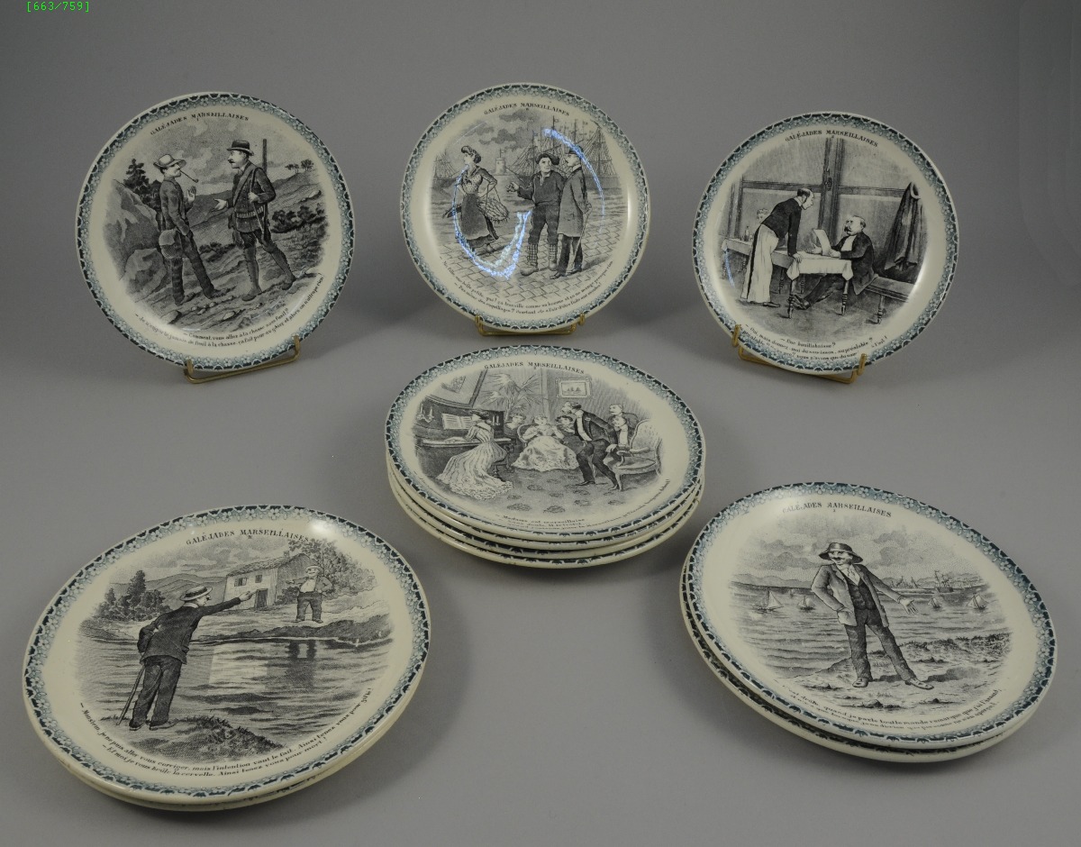 Série de ONZE ASSIETTES en faïence fine "Galejades marseillaises", décor imprimé en noir et vert de scènes humoristiques. Bordure à frise de fleurs. "Terre de Fer, HB et Cie".