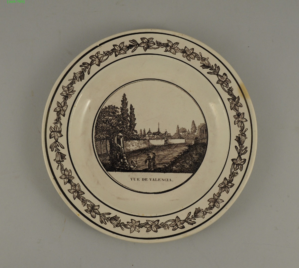 ASSIETTE en faïence fine à décor dans le bassin d'une vue de Valencia, animée de personnages. Aile de frise florale. XIXème. Diam. 24,5 cm (infime éclat)
