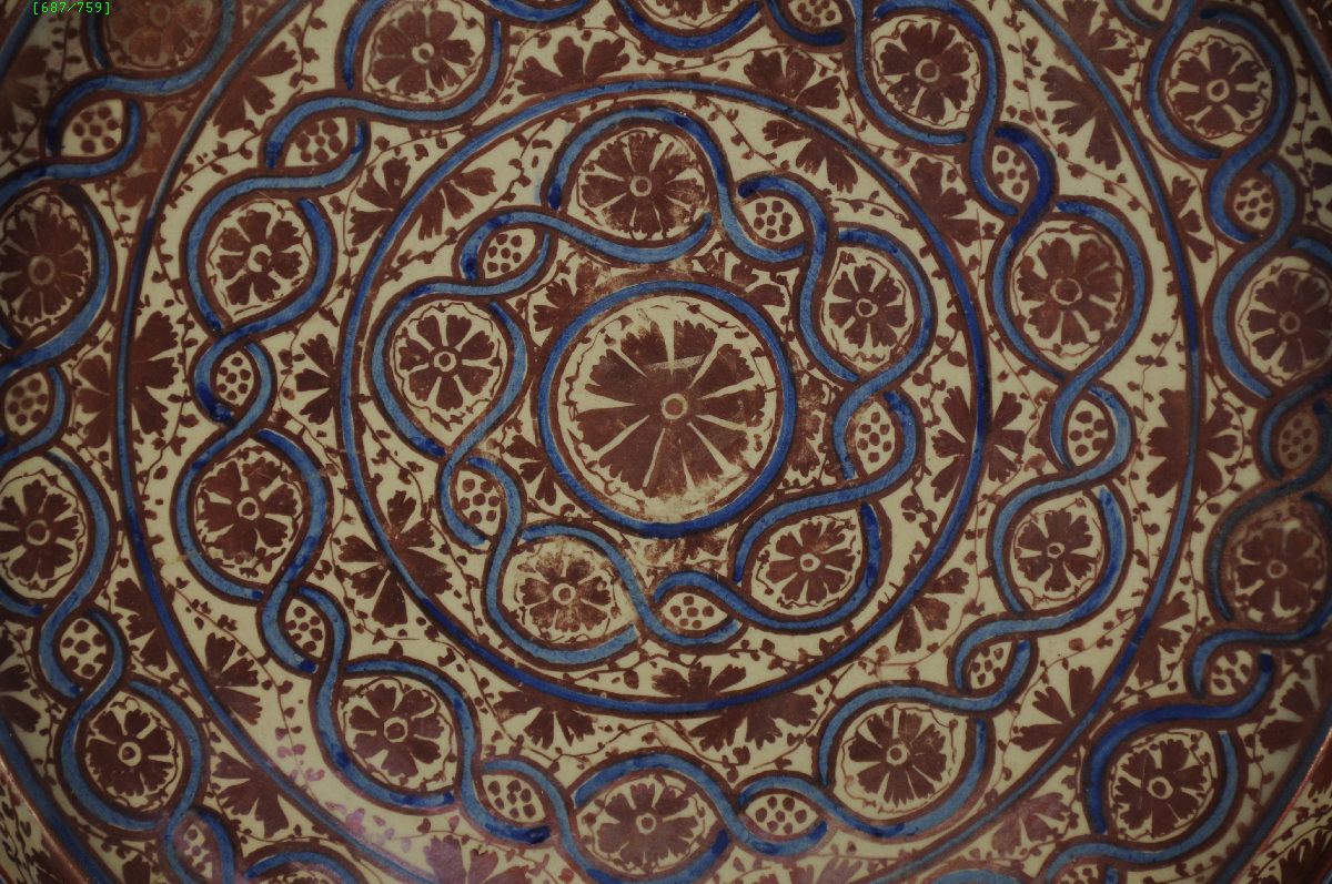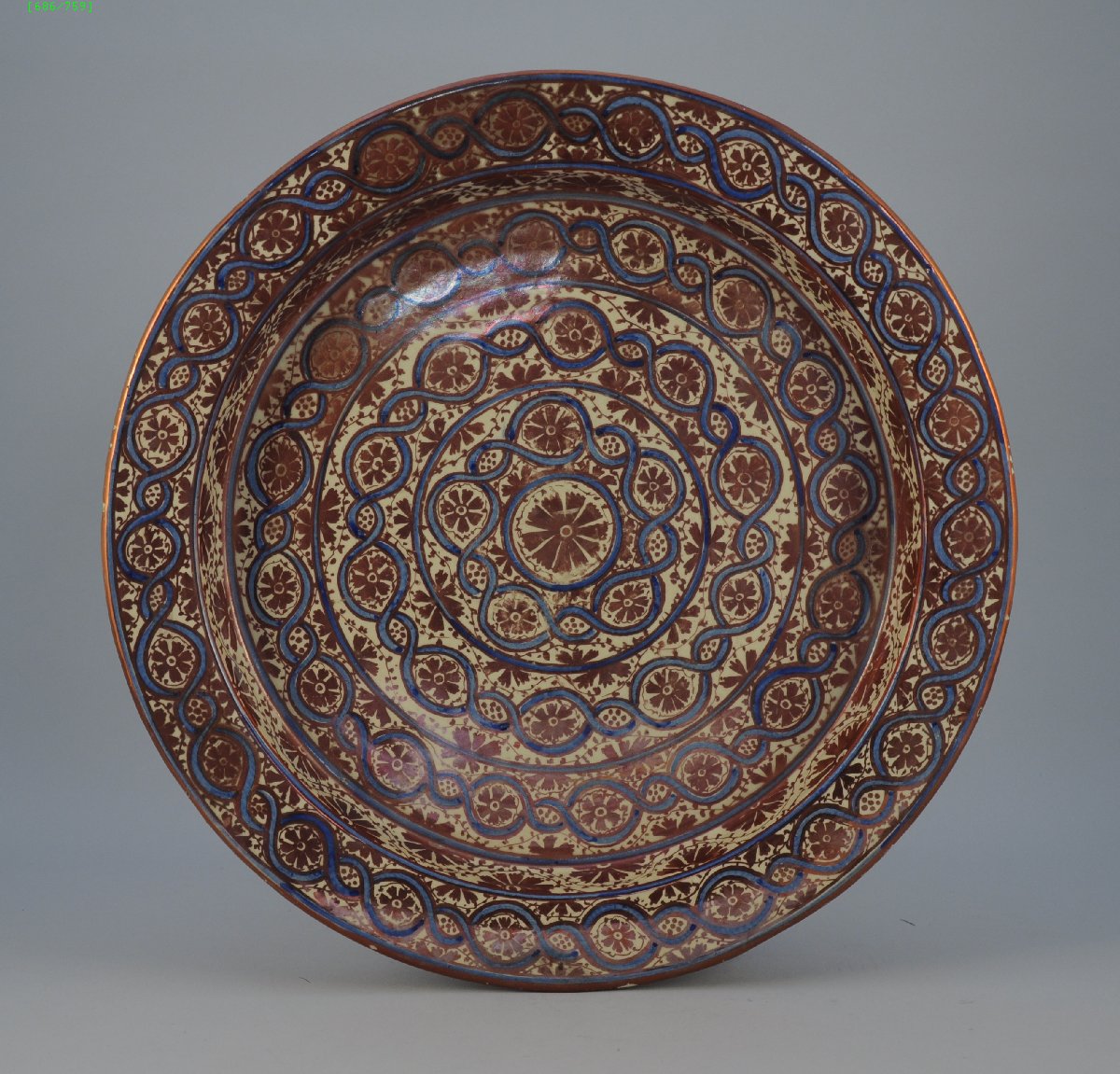 ESPAGNE. Grand PLAT BASSIN ROND en faïence de style hispano-mauresque, à décors d'émaux métalliques alternant entrelacs bleu et feuilles brunes stylisées. L'extérieur orné de motifs géométriques métallisés (un éclat).