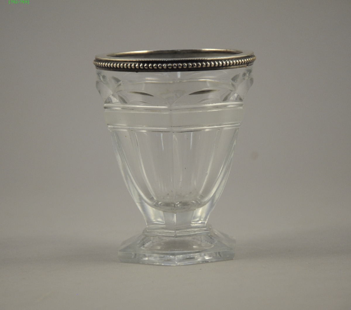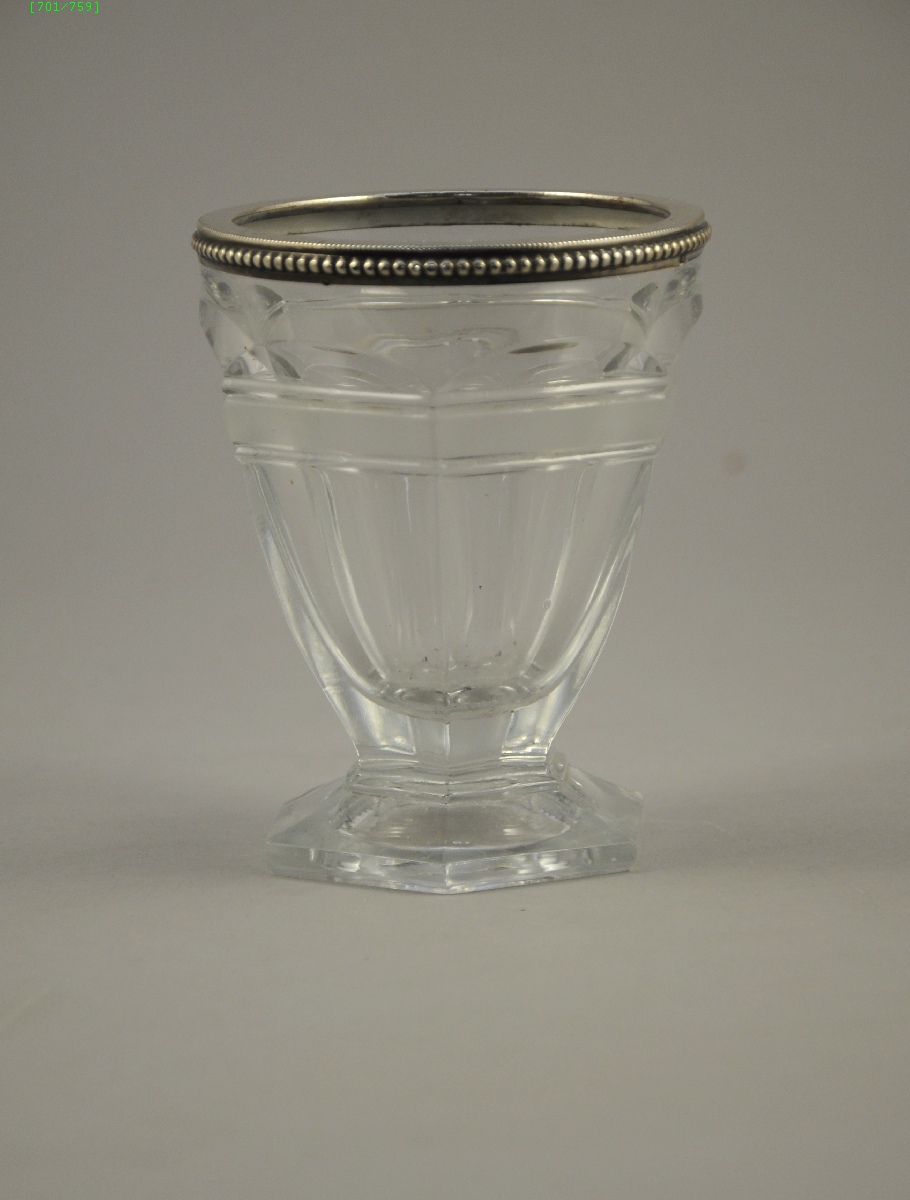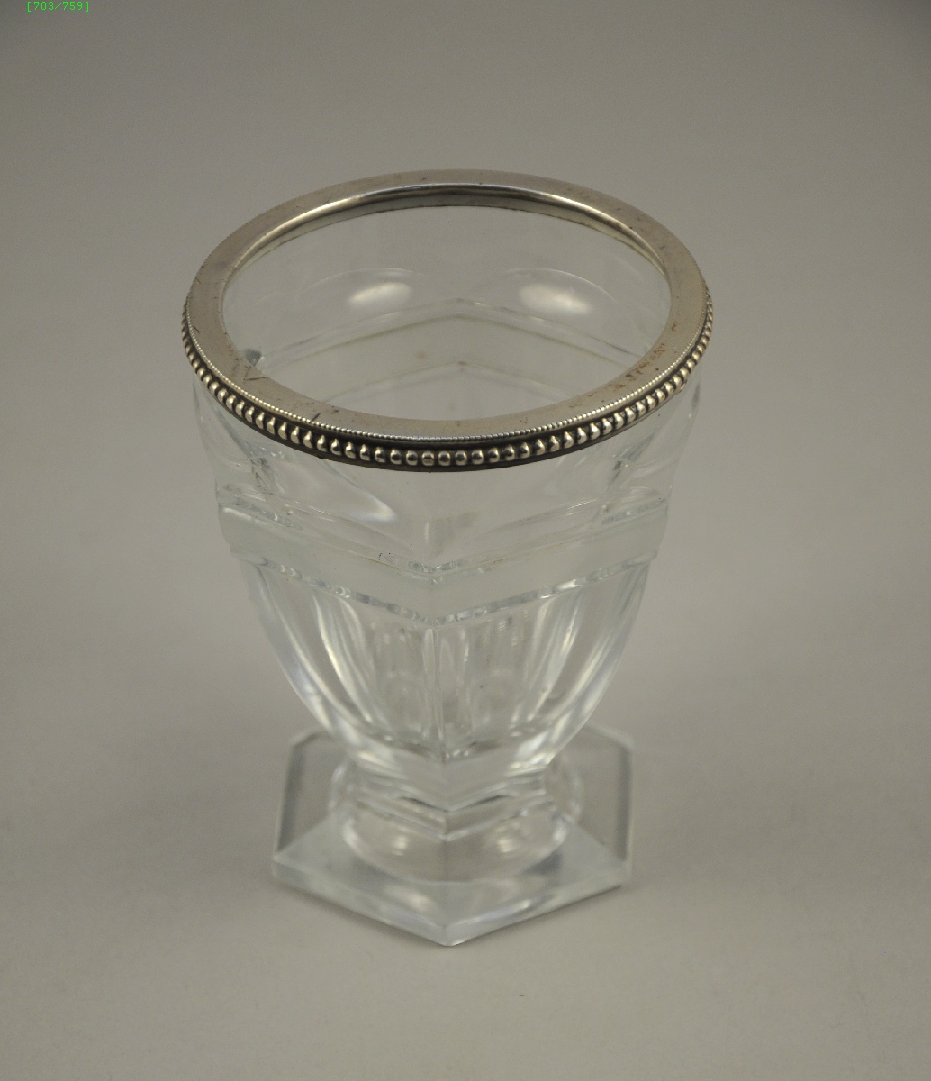 VASE en verre. Petit pied hexagonal. Corps de section ronde, à six facettes. Bordure en argent poinçon Minerve, à décor d'une frise de perles.
