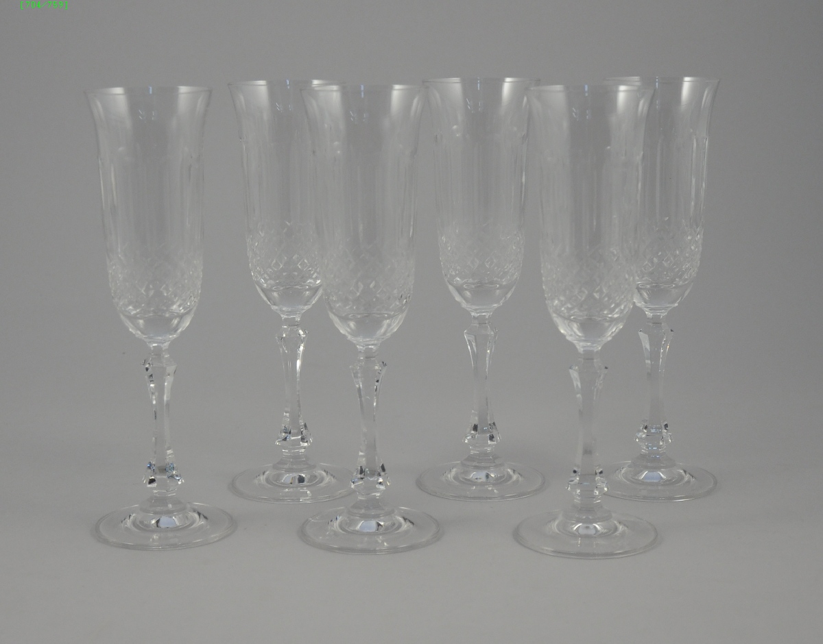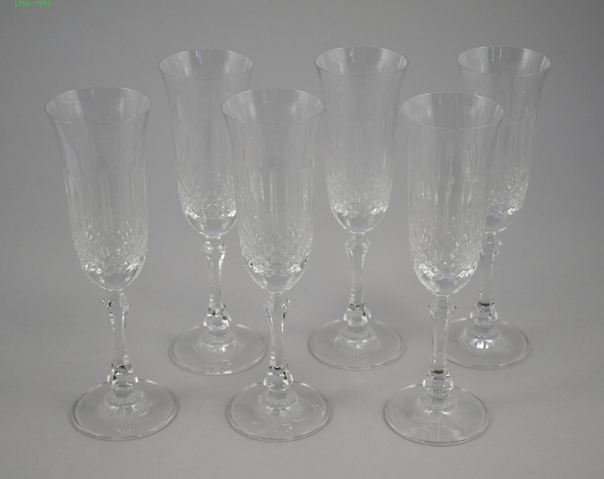 ARTISANAT DE LORRAINE. Six flûtes à Champagne en cristal taillé en facettes et à croisillons, dans leur coffret.