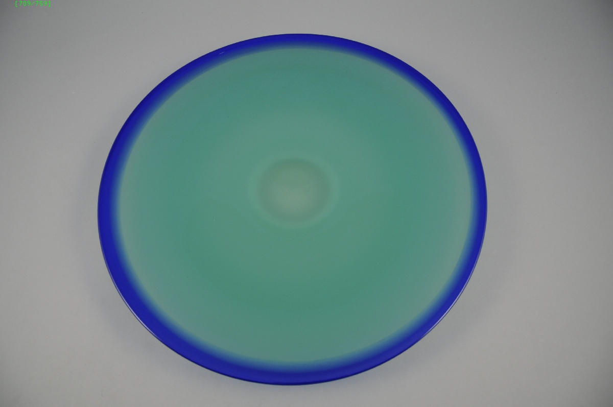 BALDWIN Philip et GUGGISBERG Monica. Plat circulaire en verre soufflé vert et bleu sur la bordure.