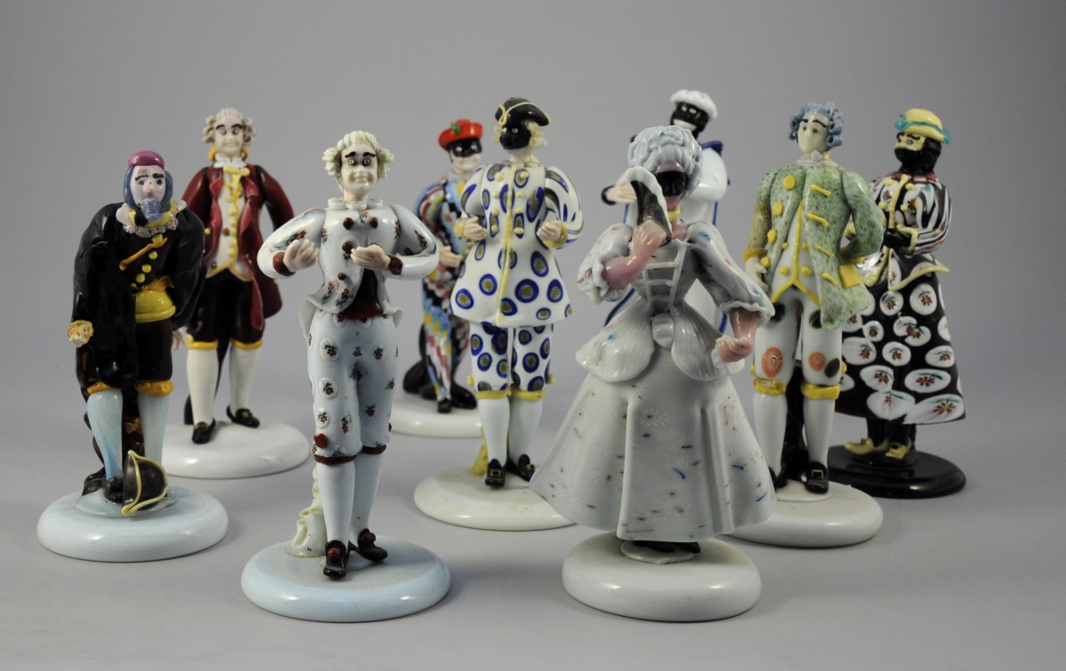 Ensemble de neuf SUJETS en verre multicolore, travaillé à la pince, figurant des personnages de la Commedia Dell' Arte.