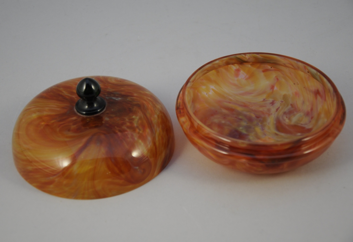 BONBONNIÈRE en verre de forme circulaire à décor jaspé dans les tons orangés, le frétel en verre de couleur vert foncé.