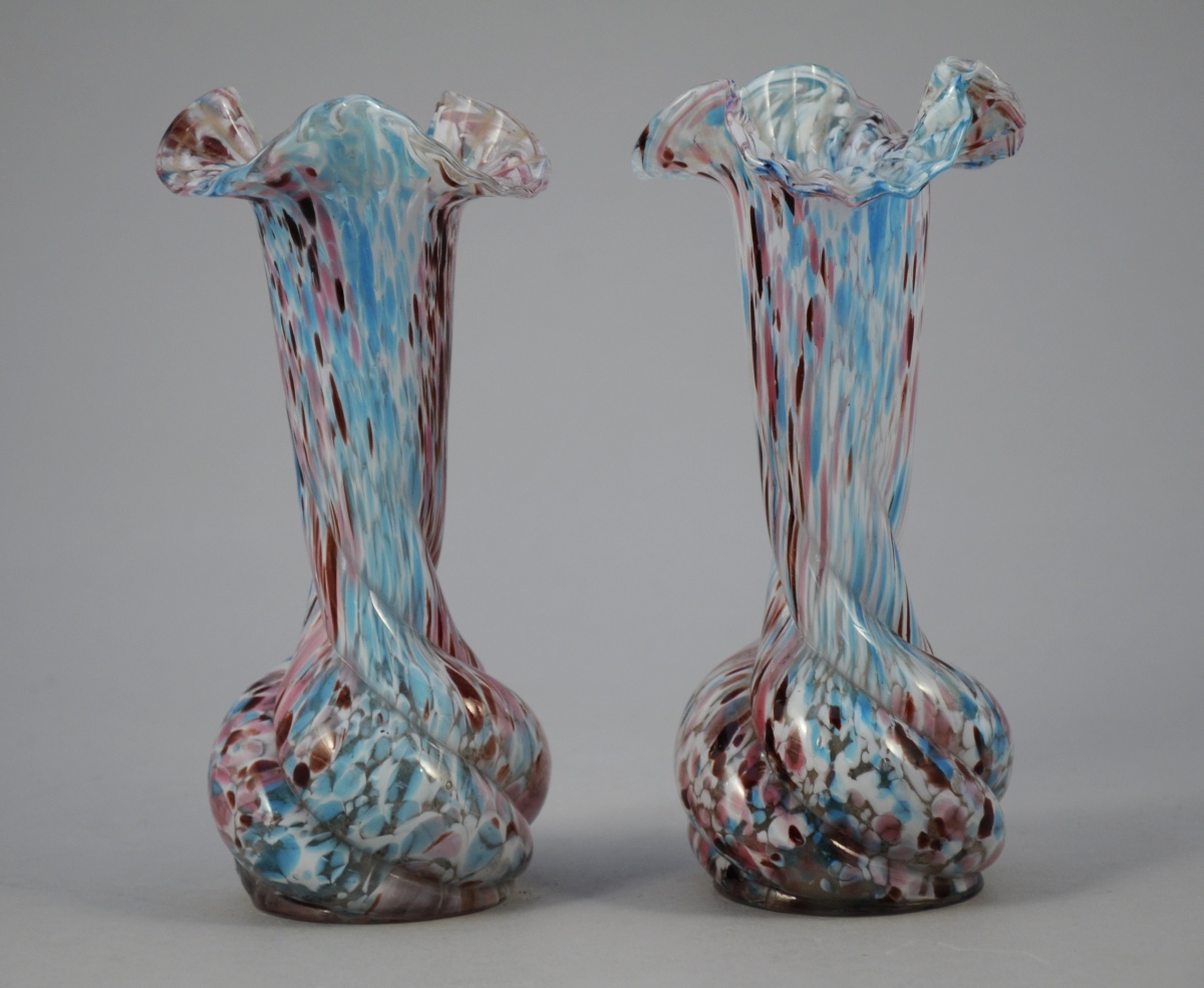 CLICHY. Paire de vases en verre à base renflée et torsadée et long col évasé et ourlé. Décor d'inclusions blanches, roses et bleues.