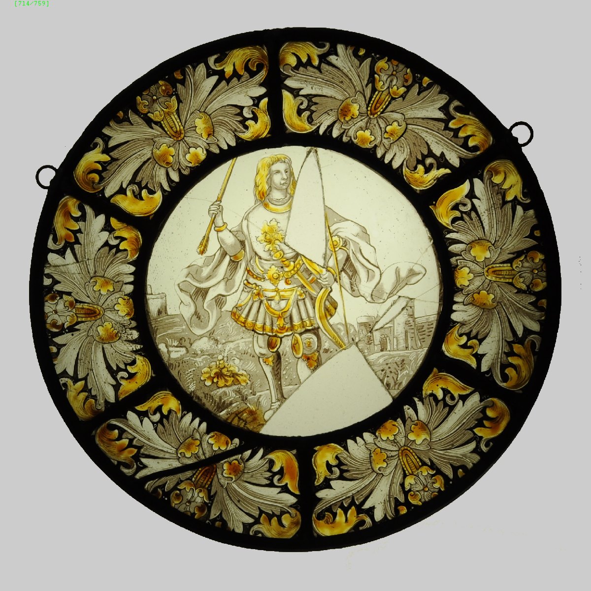 VITRAIL de forme ronde, en verre peint en jaune, rehaussé de grisaille, et ceint de plomb. Il représente dans le médaillon central un chevalier en armure, tenant un arc et une flèche, sur un fond de paysage avec une forteresse. L'entourage est orné de feuilles stylisées.