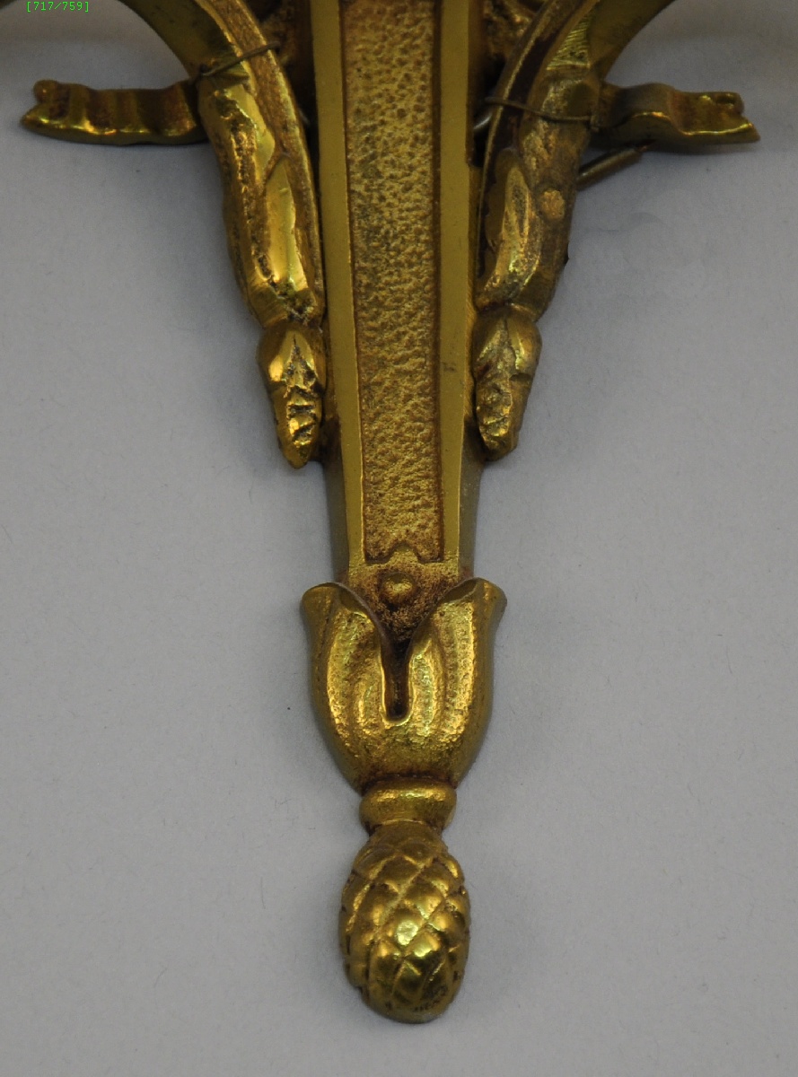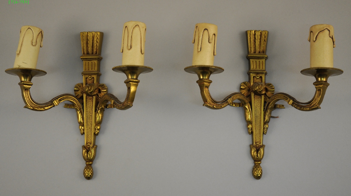 Paire d'APPLIQUES en régule doré à deux feux électrifiés réunis à une colonne par un noeud. Style Louis XVI. Moderne. Haut. 20 cm.