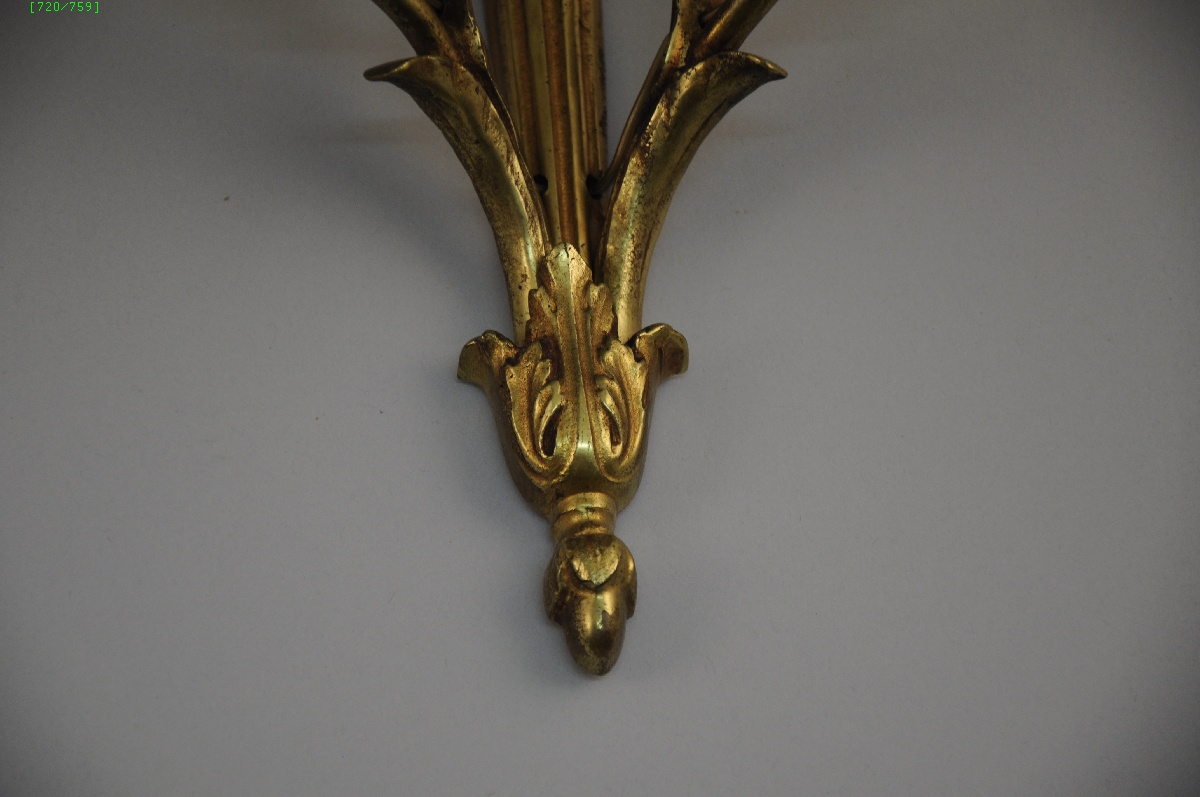 Paire d'APPLIQUES en bronze doré à deux feux électrifiés réunis par un entrelac feuillagé à une torche cannelée. Style Louis XVI. Moderne. Haut. 36 cm.