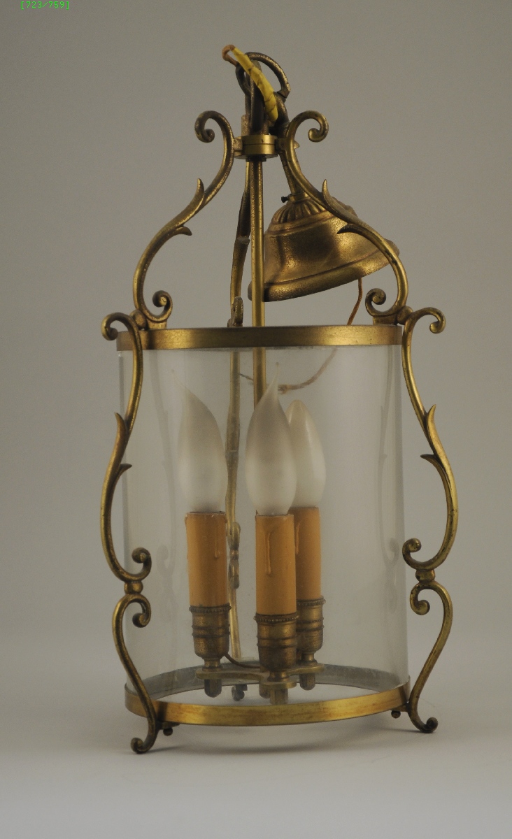 LANTERNE de vestibule en bronze et cuivre, de forme ronde à trois feux électrifiés. Moderne.