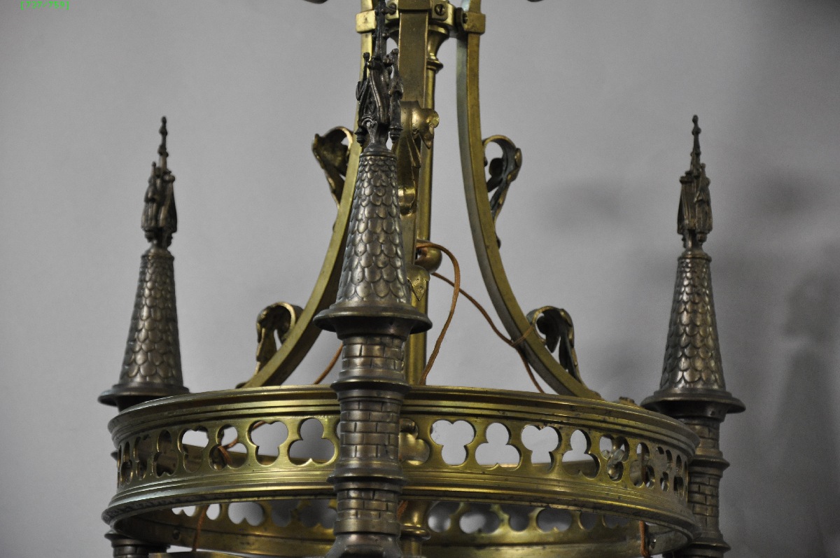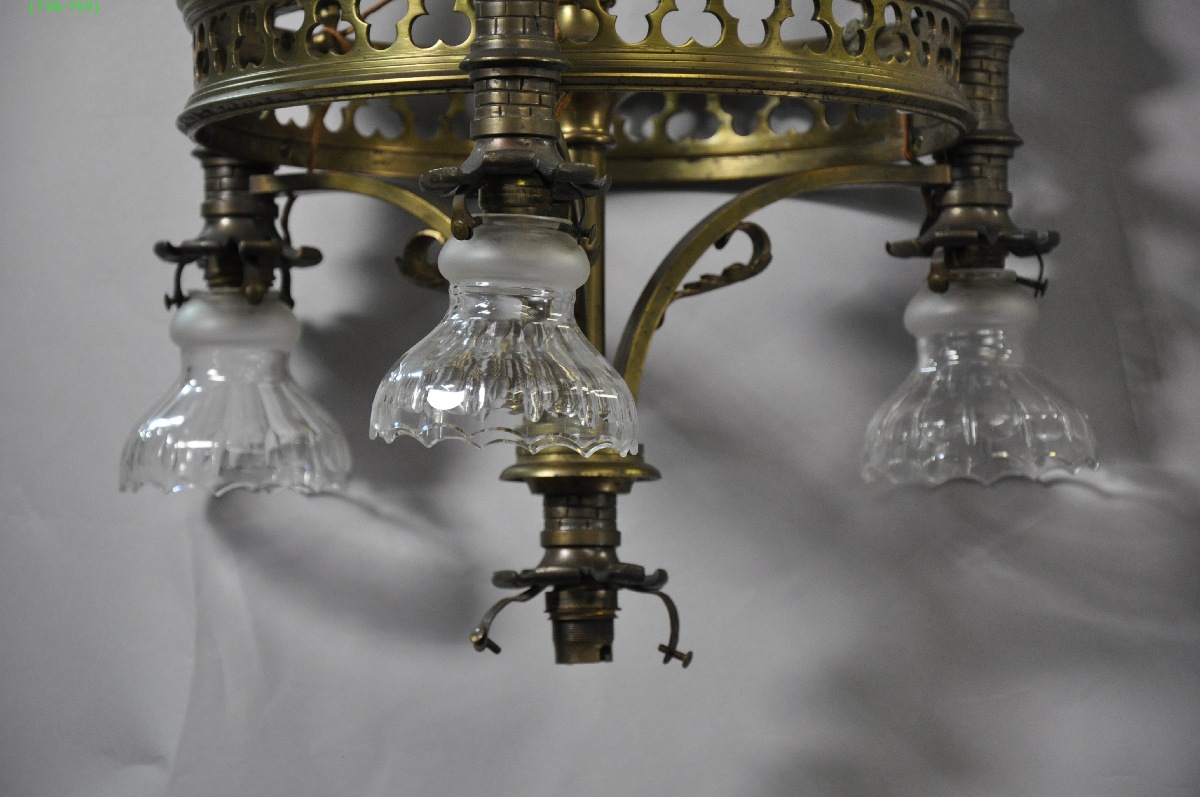 LUSTRE en bronze à quatre lumières. Monture à trois branches ornées de feuillages, soutenant une armature circulaire ajourée de trèfles et de trois pinacles. Petits abats-jours de cristal taillé à facettes.