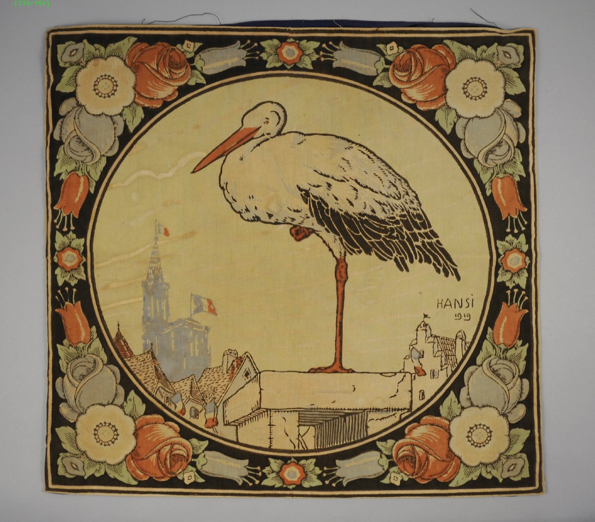 Enveloppe de coussin en tissu à décor d'une cigogne sur fond de paysage alsacien, marqué 1919.